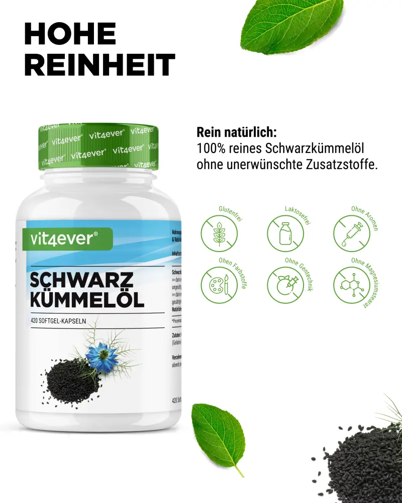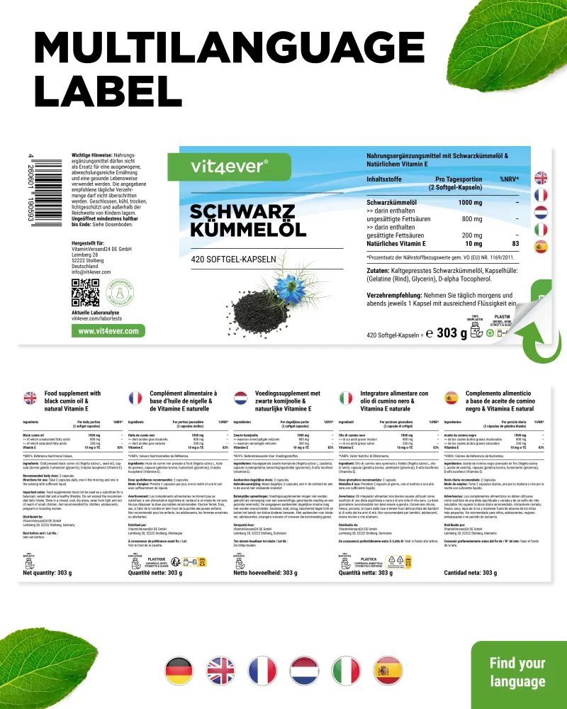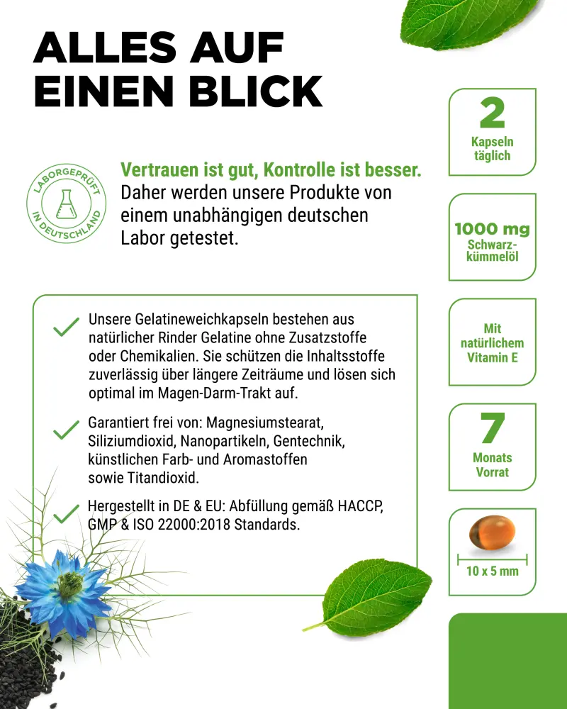 Cold-pressed black cumin oil (lat. Nigella sative), coating agent: softgel capsule made from gelatine (bovine gelatine), D-alpha tocopherol, (natural vitamin E from GMO-free soya beans), humectant: glycerol.