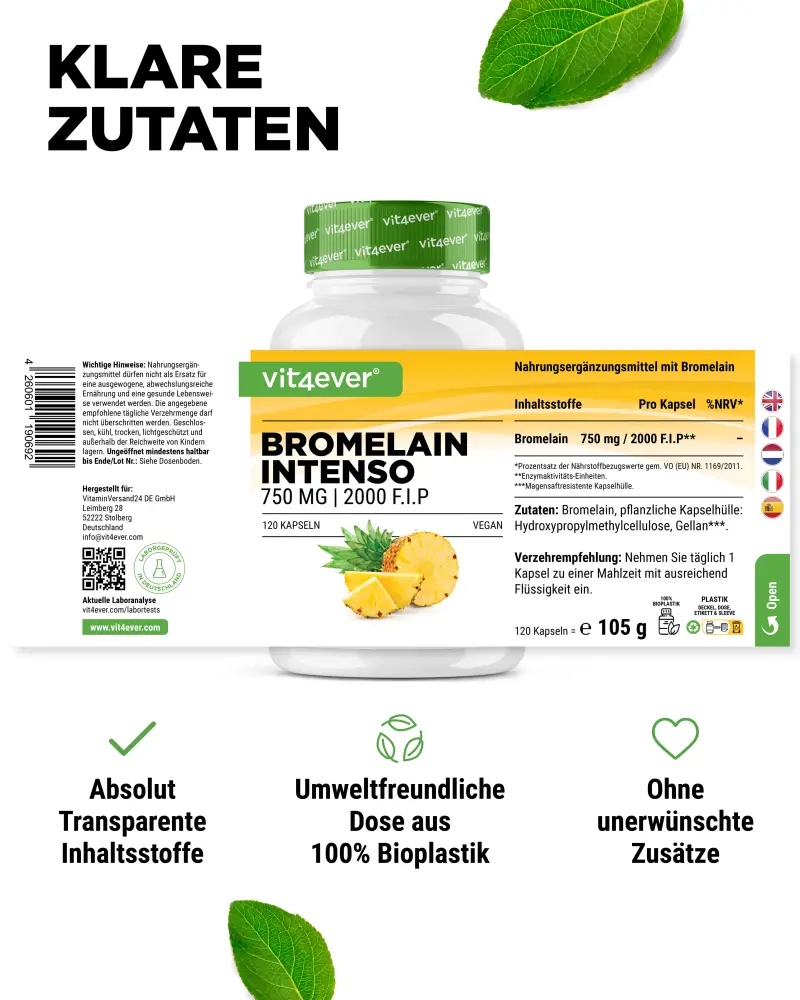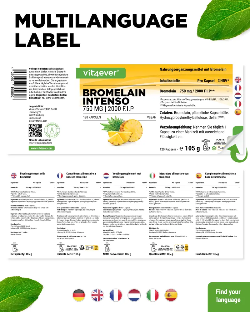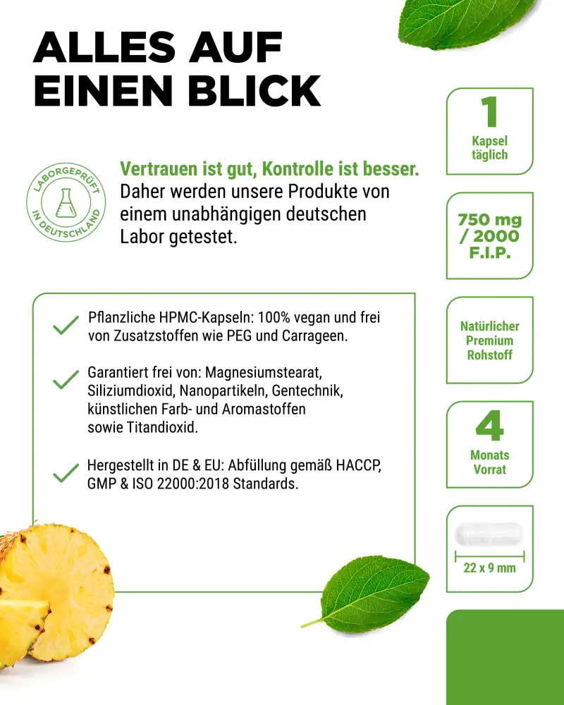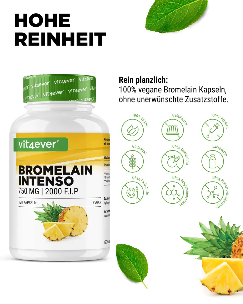 Bromelain Intenso with 2000 F.I.P (Federation Internationale Pharmaceutique = unit for measuring enzyme activity).