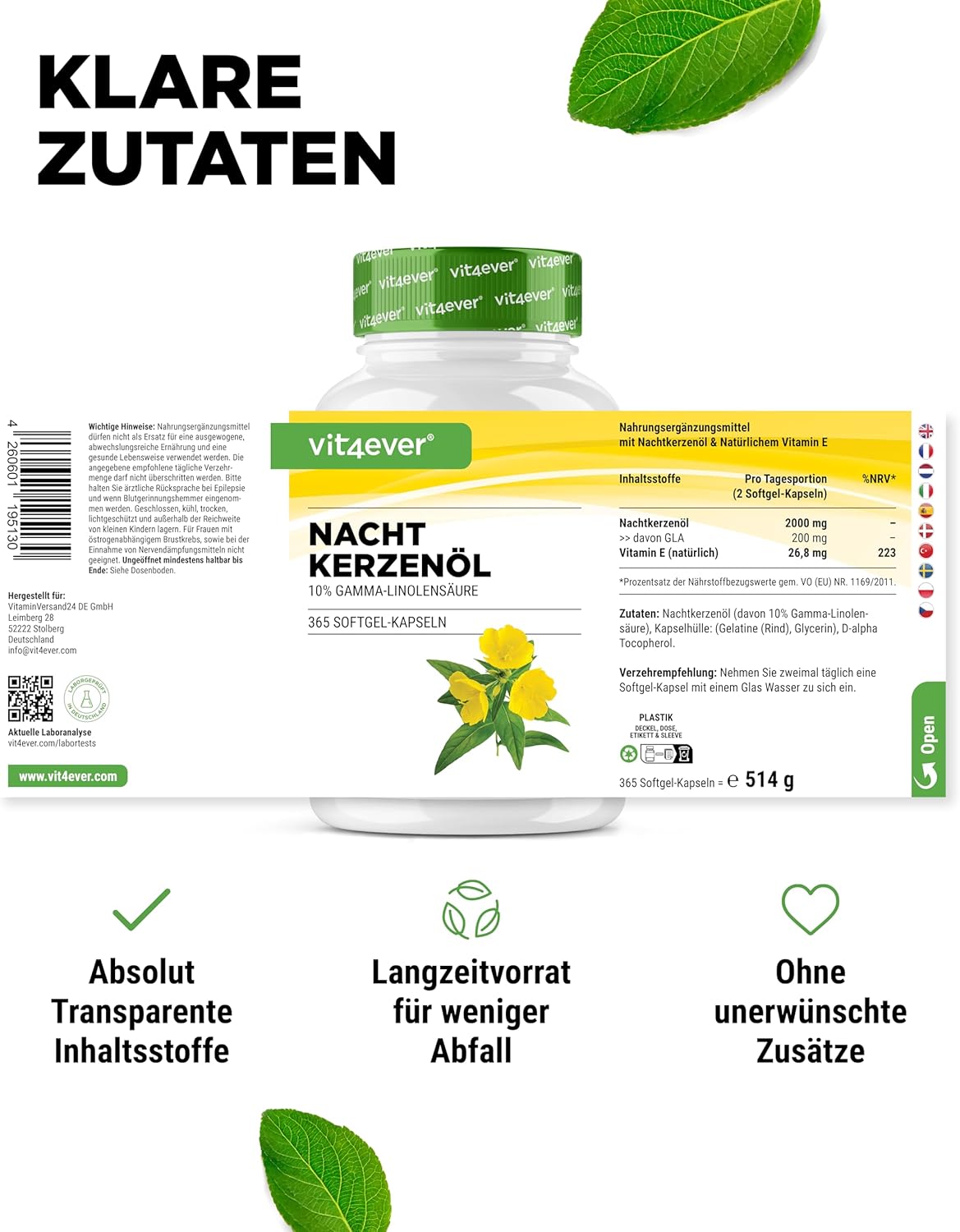 Evening primrose oil capsules contain 10 % gamma-linolenic acid (GLA) as well as the omega-6 fatty acid linolenic acid, other unsaturated fatty acids and various amino acids, minerals and vitamin E.