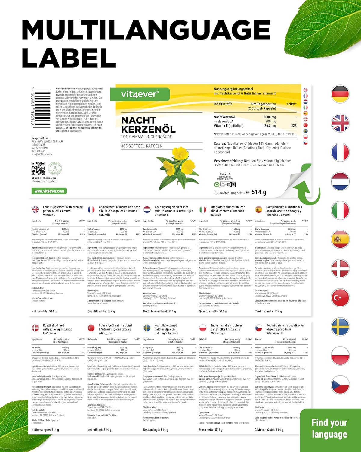 Evening primrose oil (of which 10 % gamma-linolenic acid), softgel capsule made from gelatine (bovine gelatine), vitamin E (d-alpha-tocopherol), glycerine (humectant).