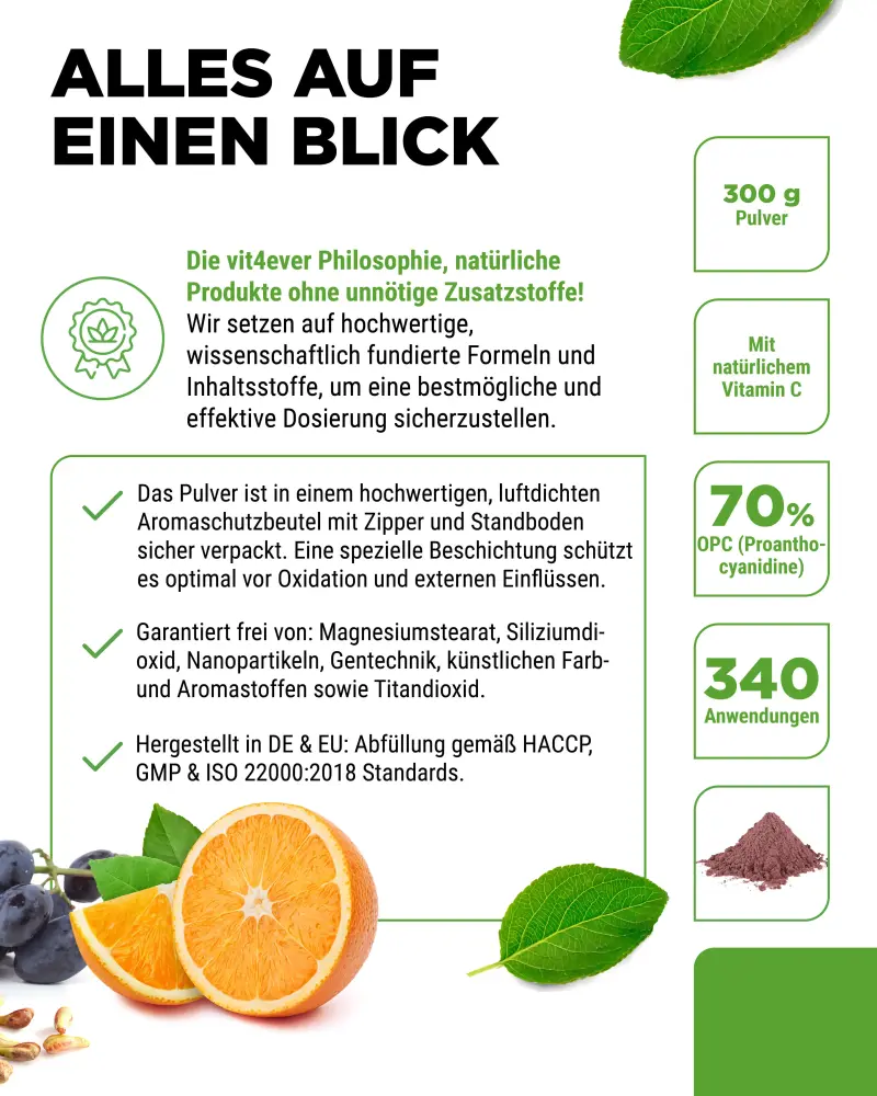 The product is optimised by vitamin C, which synergistically ensures better absorption of the OPC.