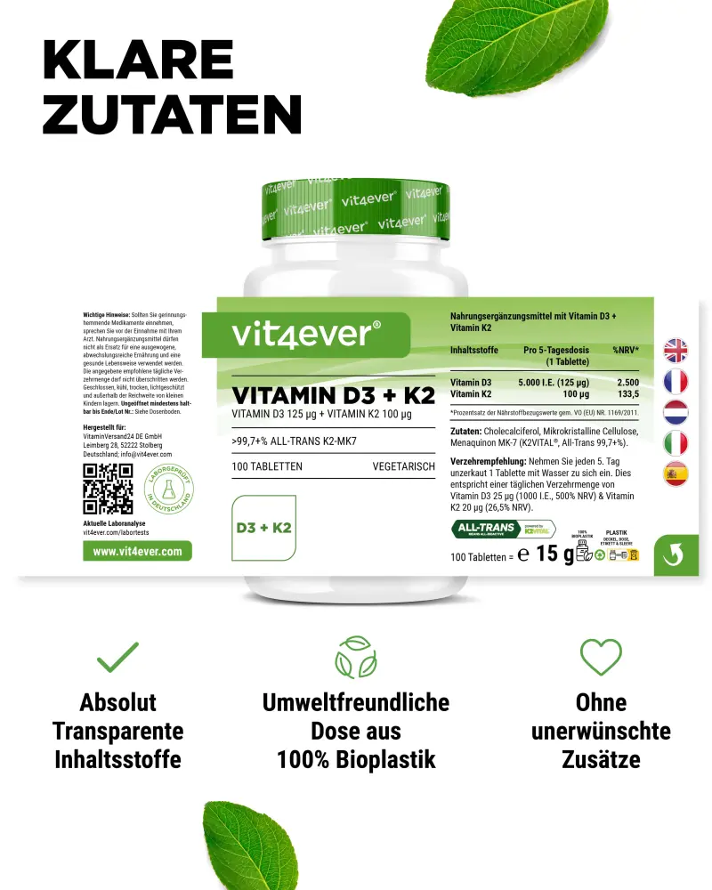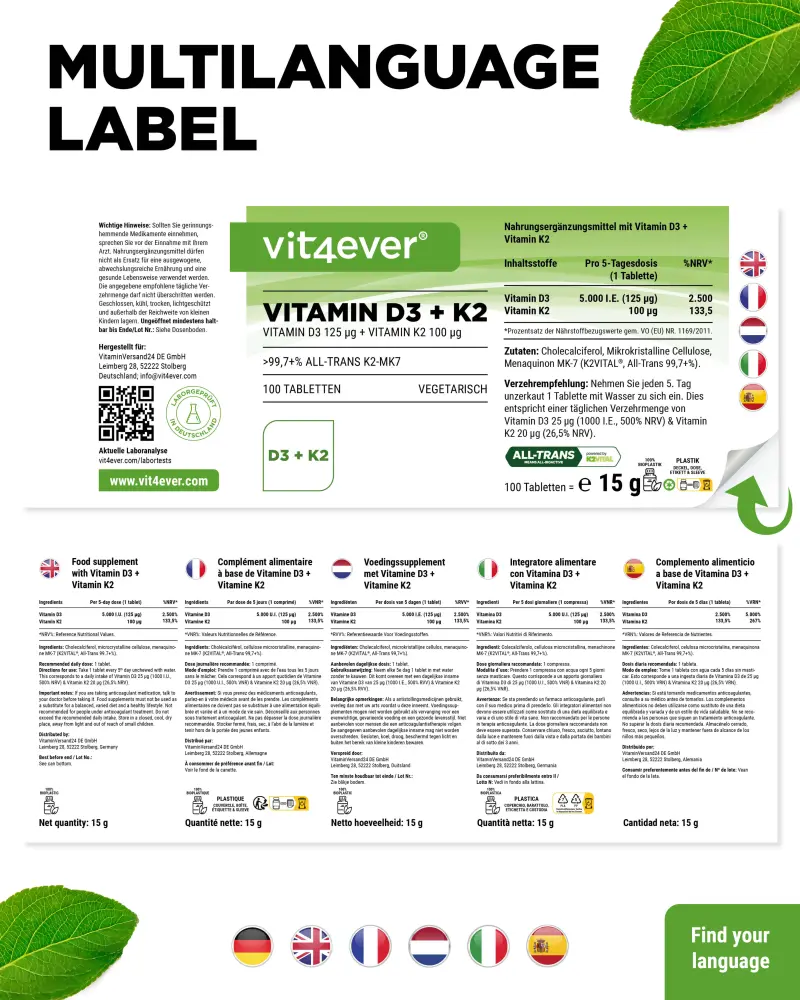 Optimally supplemented with → vitamin K2, which is an ideal partner for the D vitamin, vitamin D3 5000 I.U. + K2 is ideal for maintaining a healthy vitamin D level in the body.
