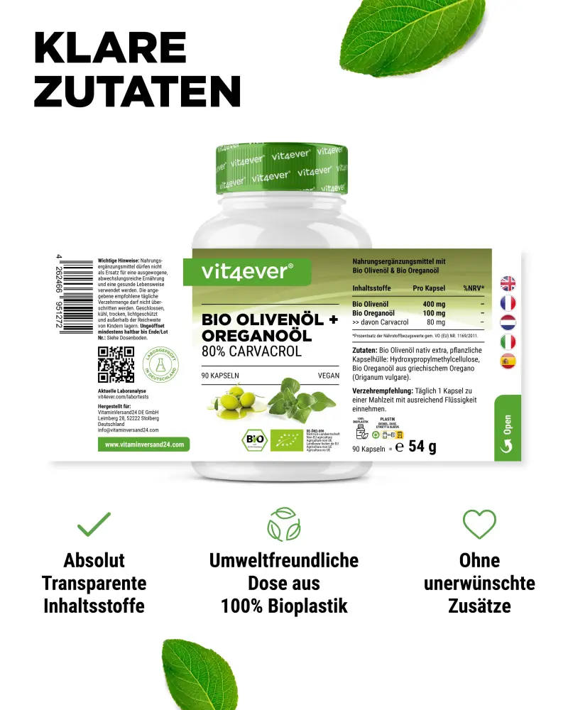 Aceite de oliva virgen extra ecológico, agente de recubrimiento: hidroxipropilmetilcelulosa (de origen vegetal), aceite de orégano ecológico procedente de orégano griego (Origanum vulgare).