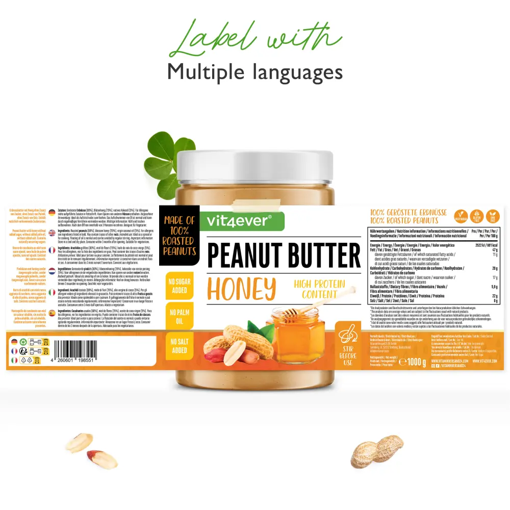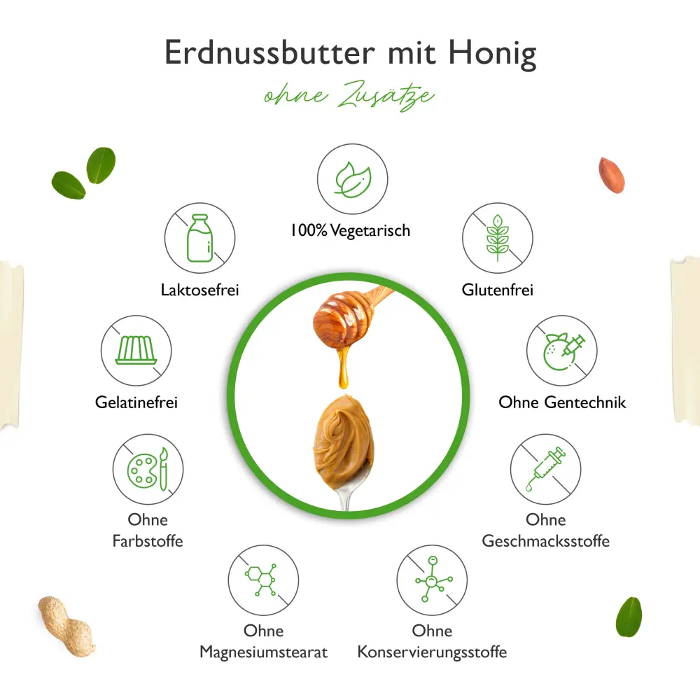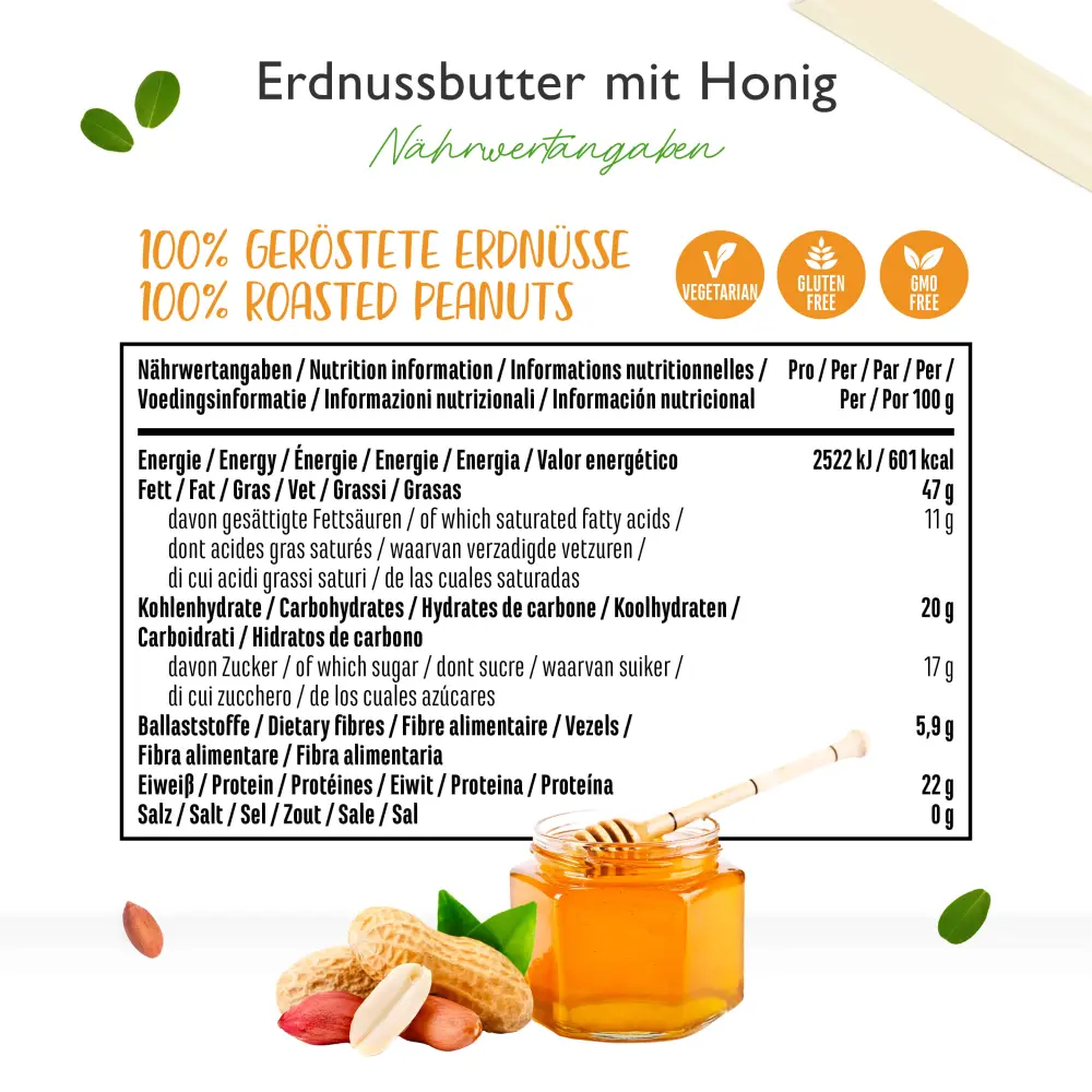 Mantequilla de cacahuete crujiente con auténtica miel de flores.
