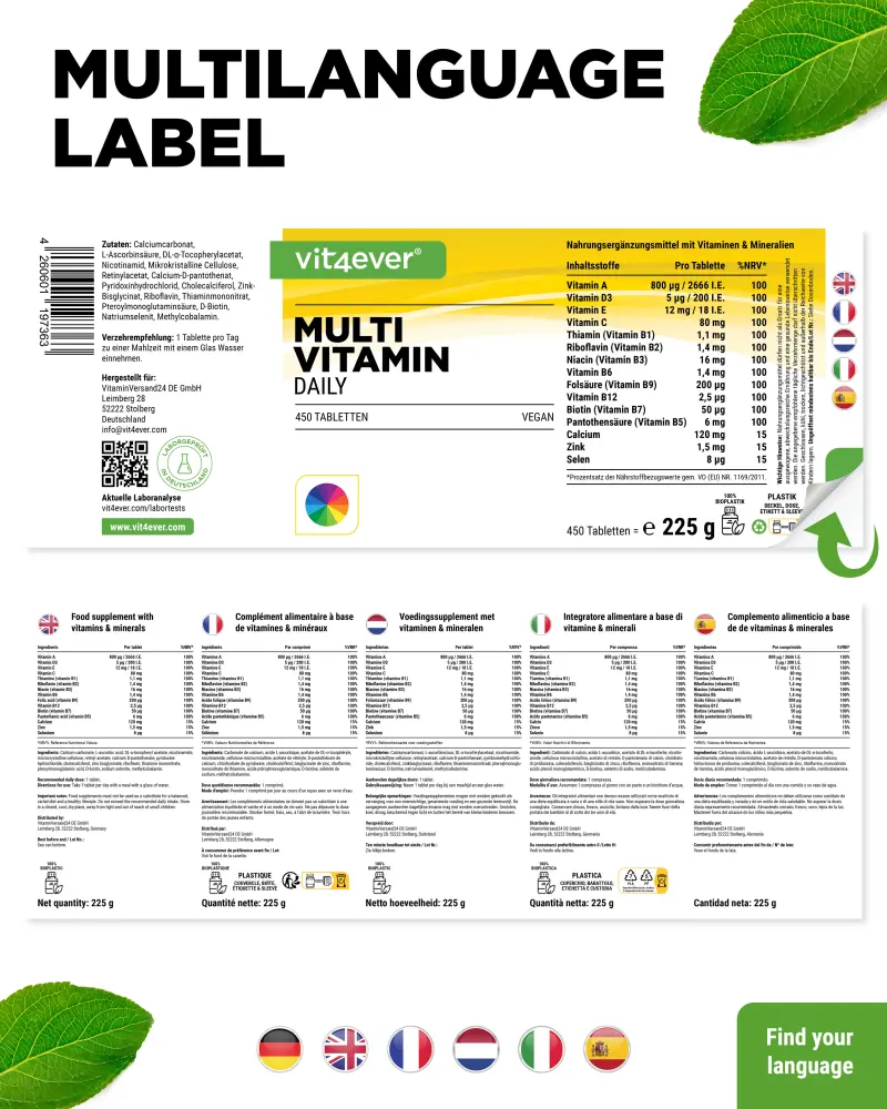 Los comprimidos contienen las vitaminas A, C, D3, E, B1, B2, B3, B5, B6, B7, B9 y B12, así como los minerales calcio, zinc y selenio.