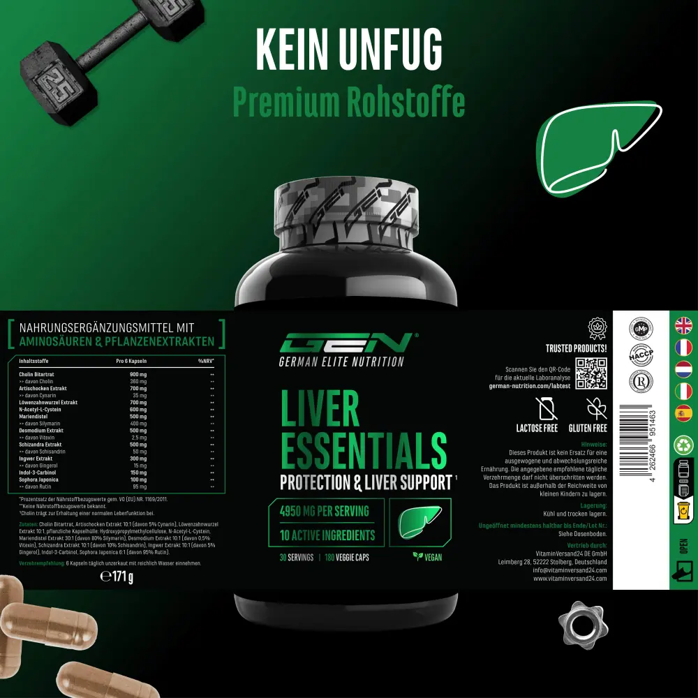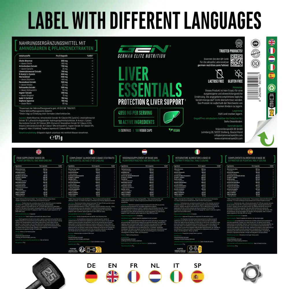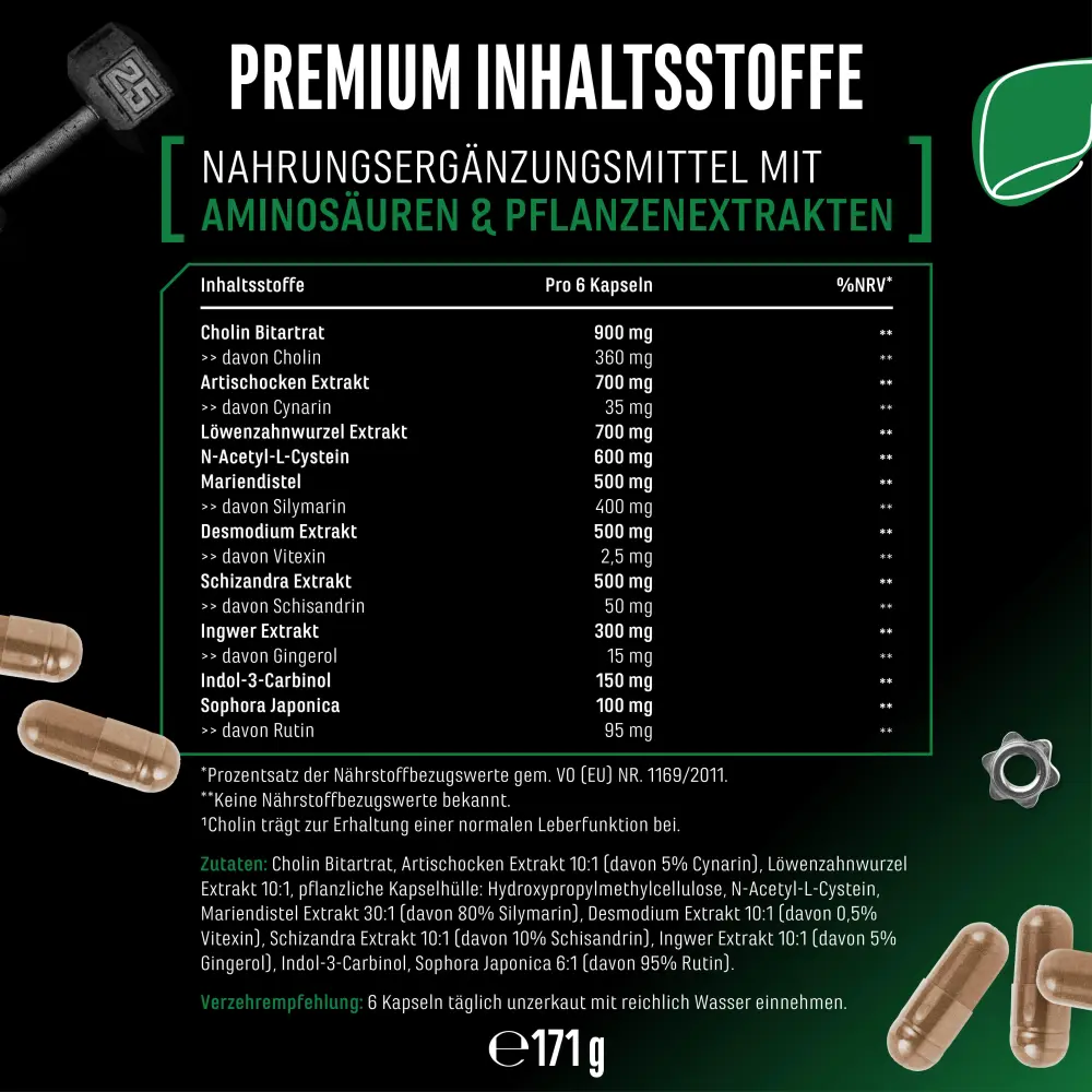 Extrait d’artichaut (dont 2,5% de cynarine), extrait de racine de pissenlit 10:1, enveloppe végétale de la capsule : Hydroxypropylméthylcellulose, N-acétyl-L-cystéine, extrait de chardon-marie (dont 80% de silymarine), extrait de desmodium (dont 0,5% de vitexine), extrait de schizandra (dont 10% de schisandrine), bitartrate de choline, extrait de gingembre (dont 5% de gingérol), indol-3-carbinol, sophora japonica (dont 95% de rutine), extrait de poivre noir (dont 95% de pipérine).