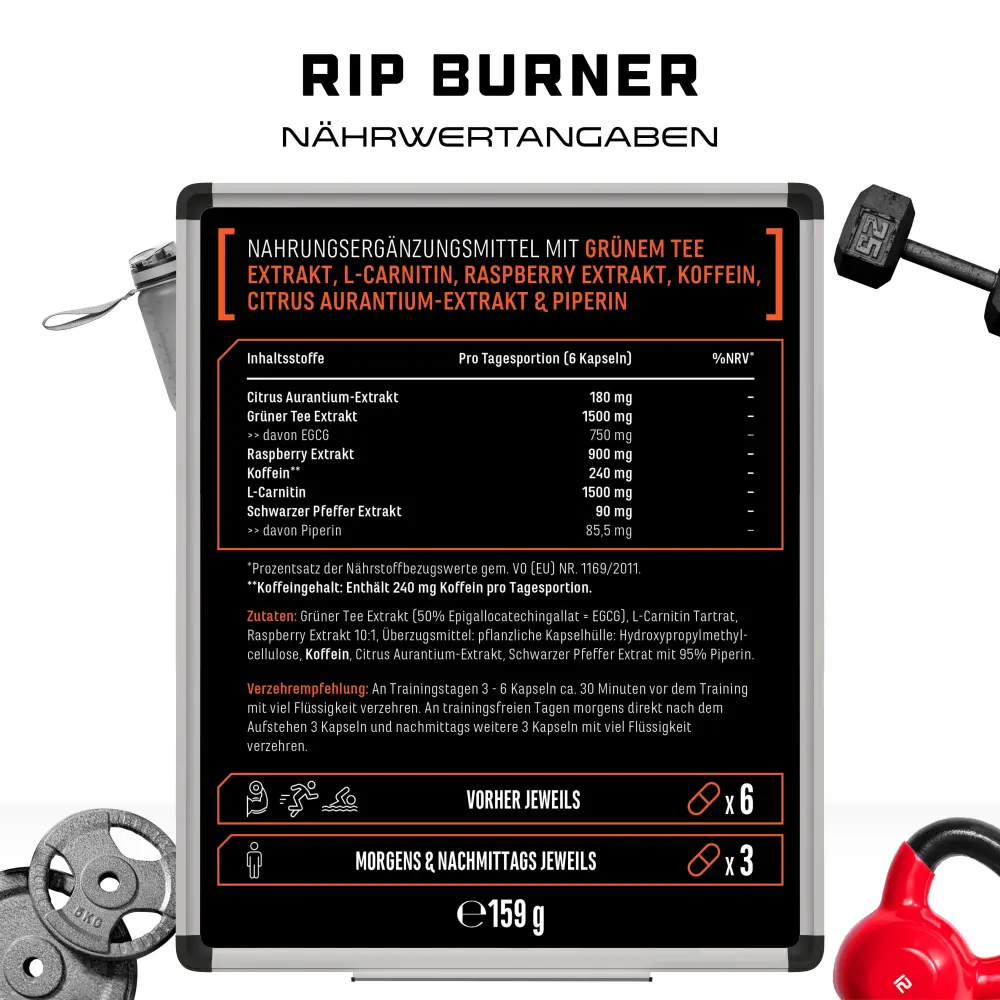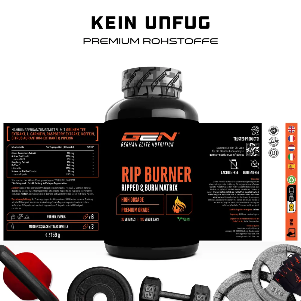 Extrait de thé vert (50% épigallocatéchine gallate = EGCG), tartrate de L-carnitine, extrait de framboise 10:1, gélule de gélatine (gélatine de bœuf), caféine, extrait de citrus aurantium, pipérine, antiagglomérant : mélange d’extraits de riz, colorants de l’enveloppe de la gélule : dioxyde de titane, azorubine, oxyde de fer rouge, oxyde de fer jaune.