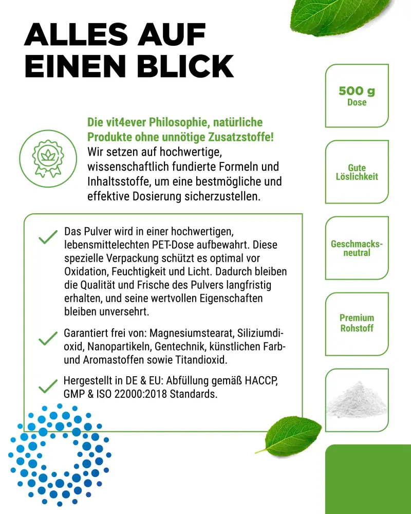 • Testé en laboratoire indépendant sur la pollution et les impuretés, comme par exemple les métaux lourds, les moisissures, E. Coli, les salmonelles et autres critères de contrôle pertinents.