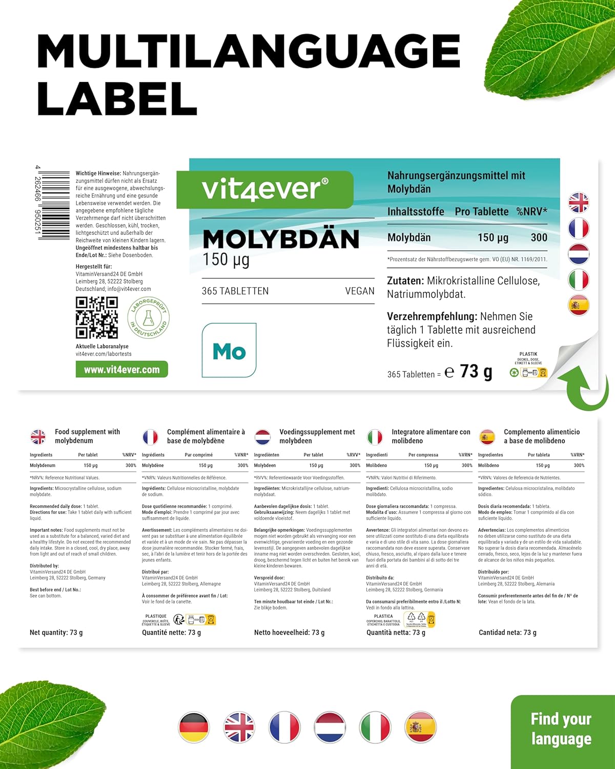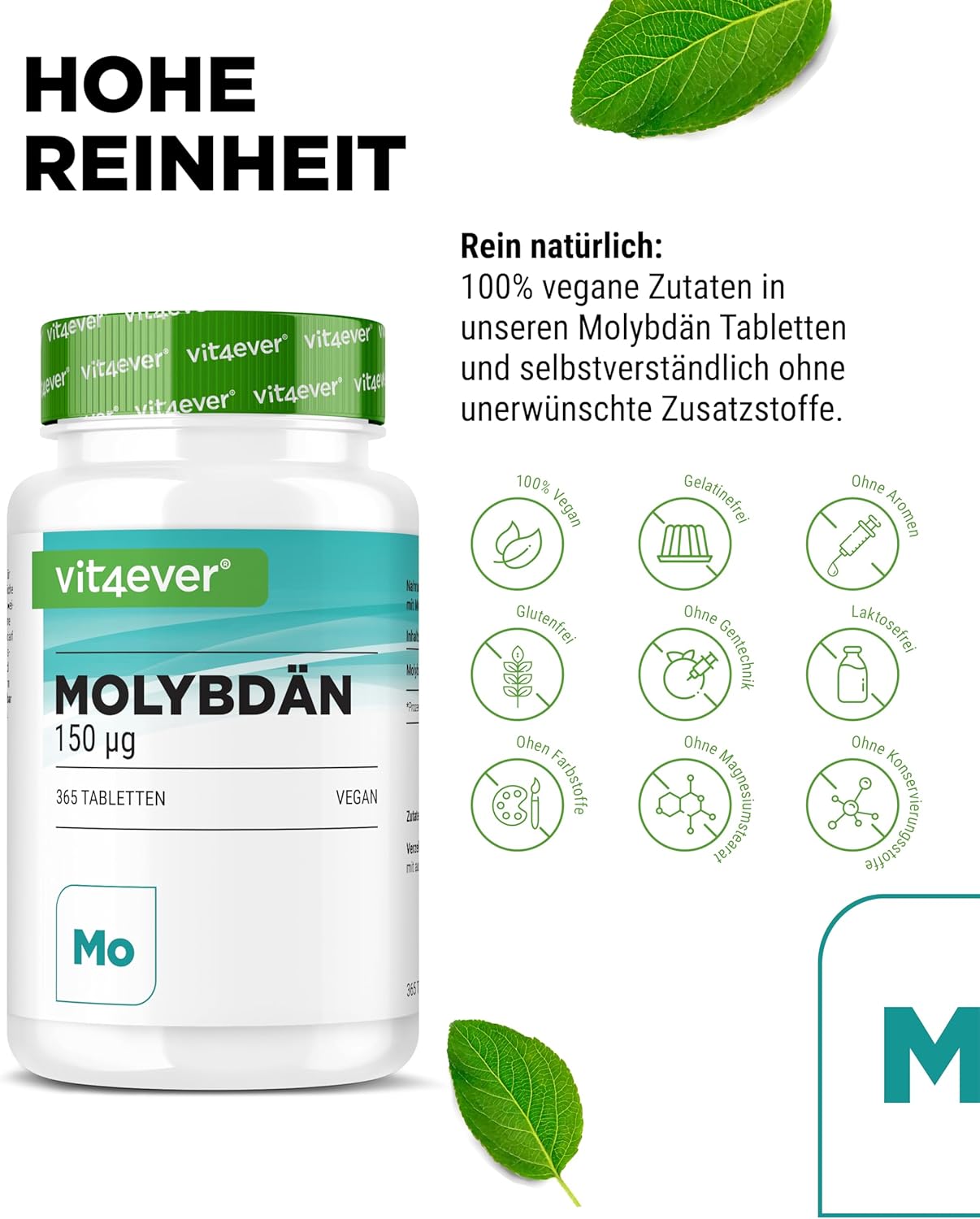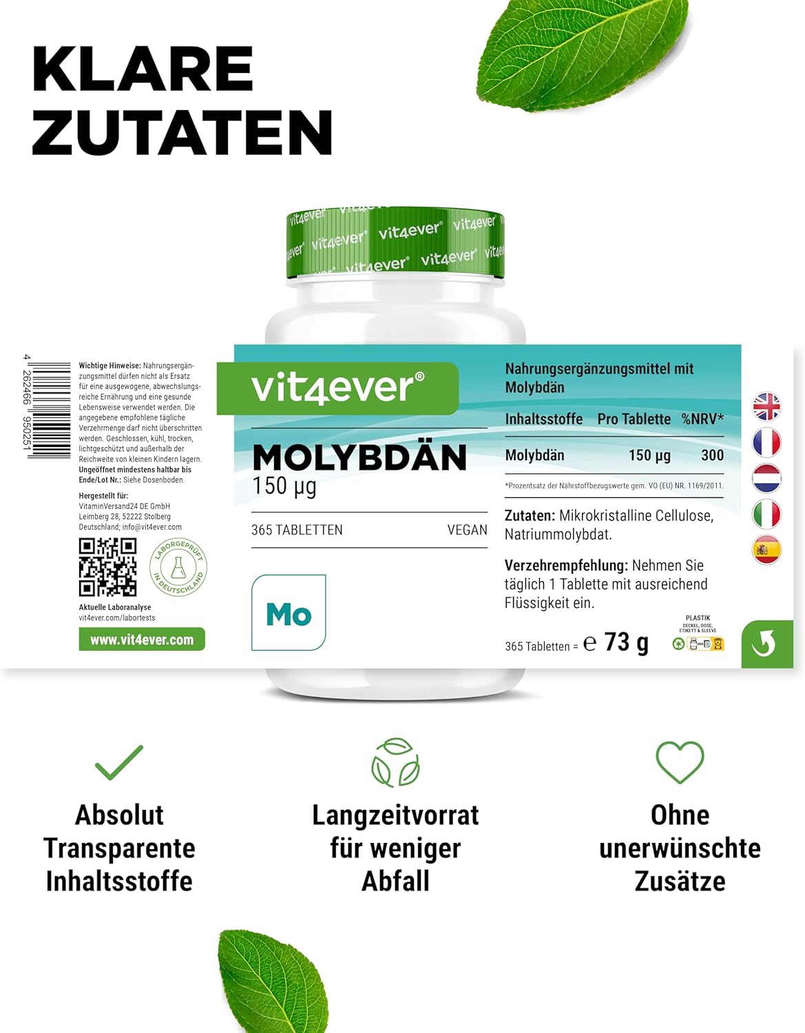 Cellulose microcristalline (agent de charge), molybdate de sodium (contient 39% de molybdène).