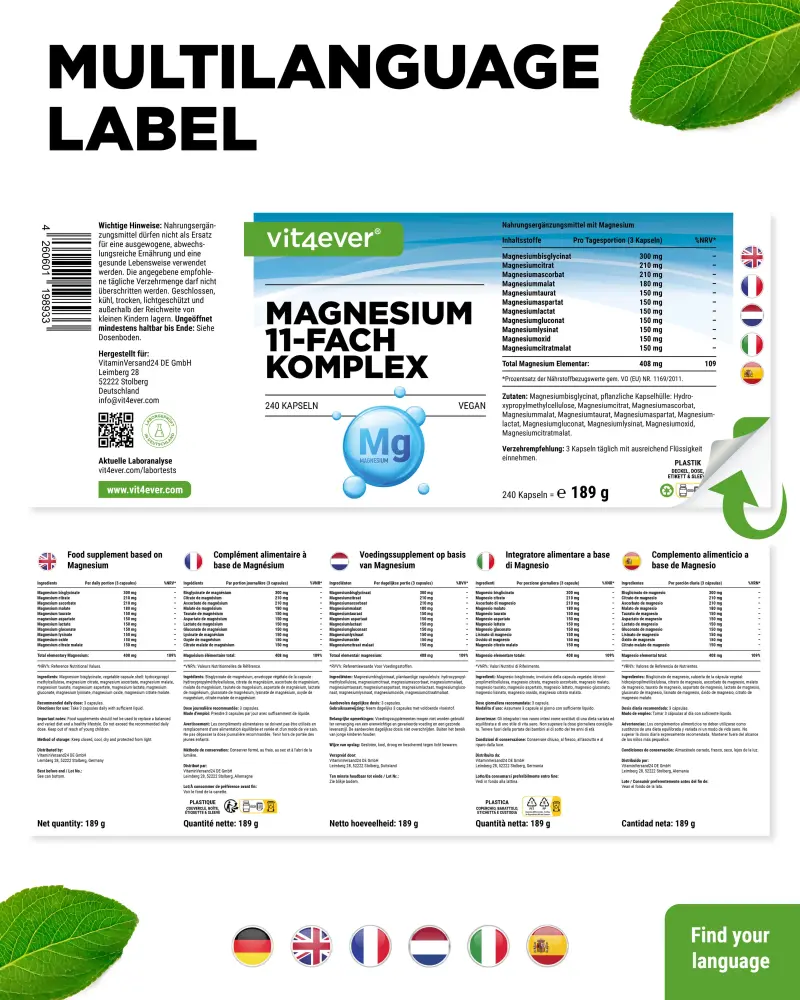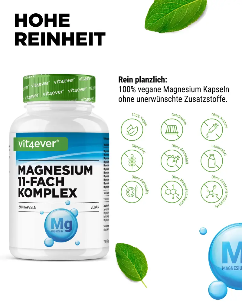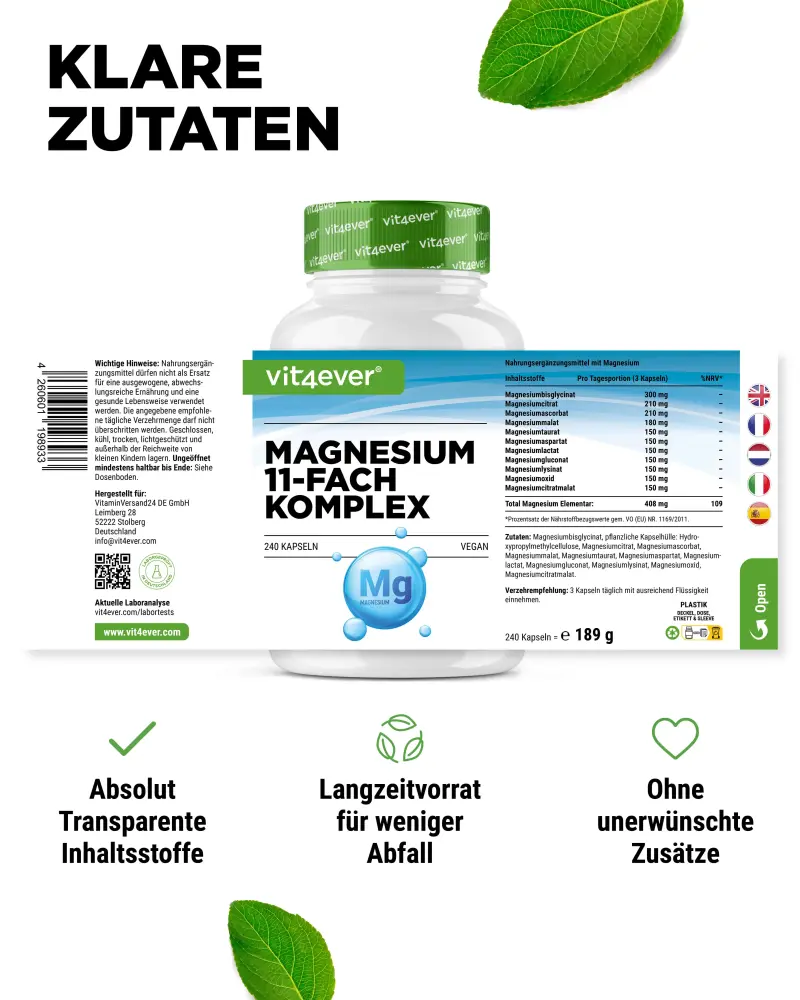 Le complexe de magnésium 11 fois offre au corps pas moins de 11 composés de magnésium différents qui agissent ensemble comme un orchestre bien coordonné et fournissent à ton corps du → magnésium élémentaire de manière différente mais optimale grâce aux propriétés respectives de ces composés.