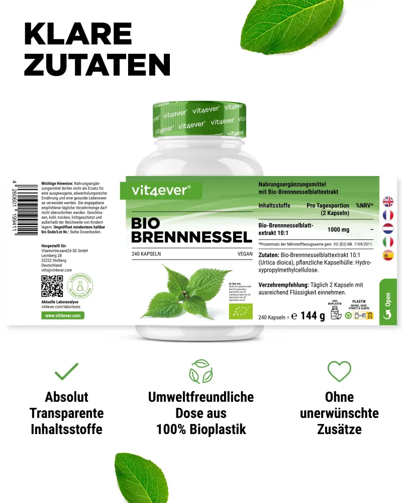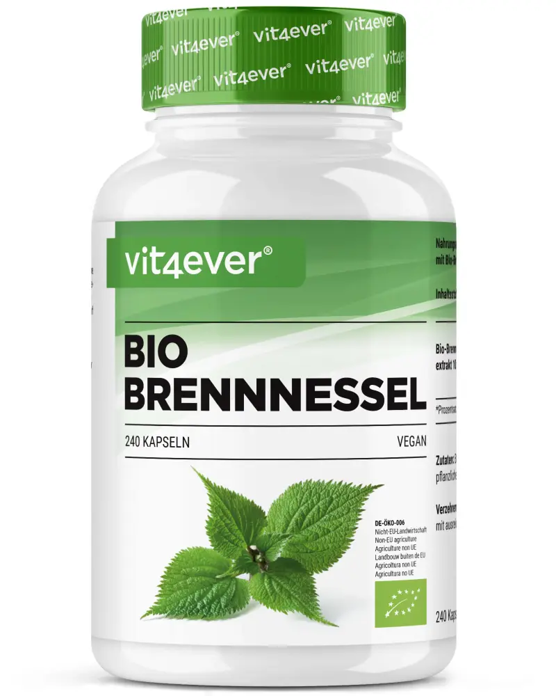 Extrait de feuille d’ortie bio 10:1 (Urtica dioica), enveloppe végétale de la capsule : hydroxypropylméthylcellulose.