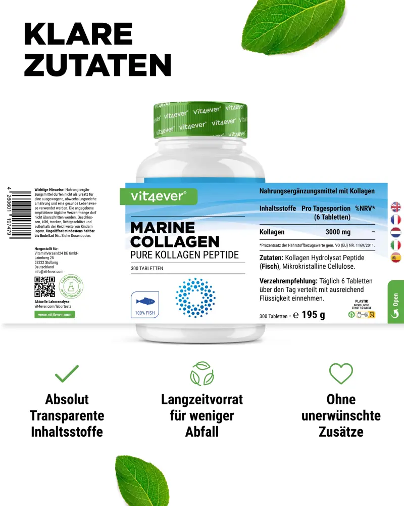 I peptidi di collagene (idrolizzato) del pesce forniscono collagene di tipo I e hanno un’eccellente biodisponibilità ed efficacia.