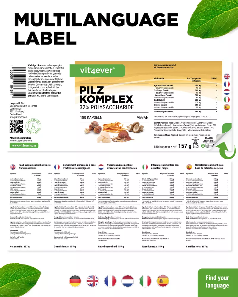 Estratto di Agaricus Blazei (30% di polisaccaridi), estratto di Cordyceps (30% di polisaccaridi), estratto di criniera di leone (estratto di Hericium Erinaceus, 30% di polisaccaridi), estratto di Reishi (40% di polisaccaridi), estratto di Shiitake (30% di polisaccaridi), involucro della capsula vegetale: idrossipropilmetilcellulosa.