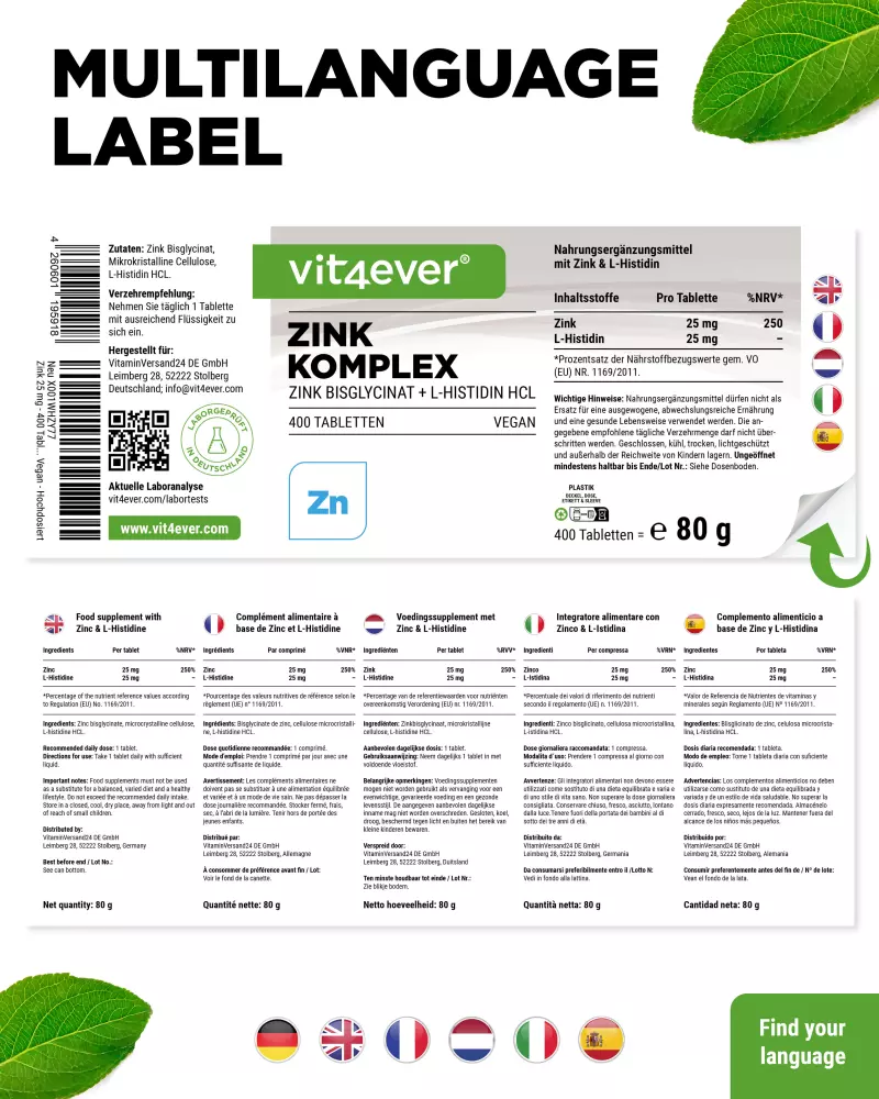 Zinco bisglicinato, cellulosa microcristallina (agente di carica), L-istidina HCL.