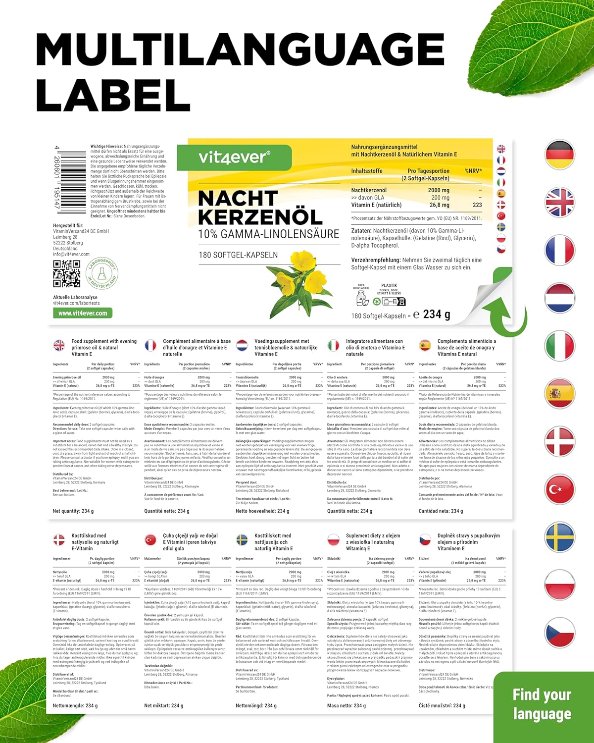 Olio di enotera (di cui il 10% di acido gamma-linolenico), agente di rivestimento: capsula softgel in gelatina (gelatina bovina), vitamina E (d-alfa-tocoferolo), glicerina (umidificante).