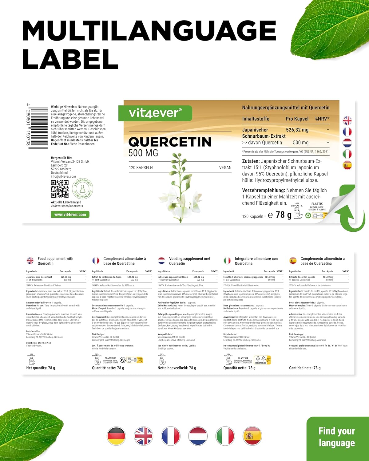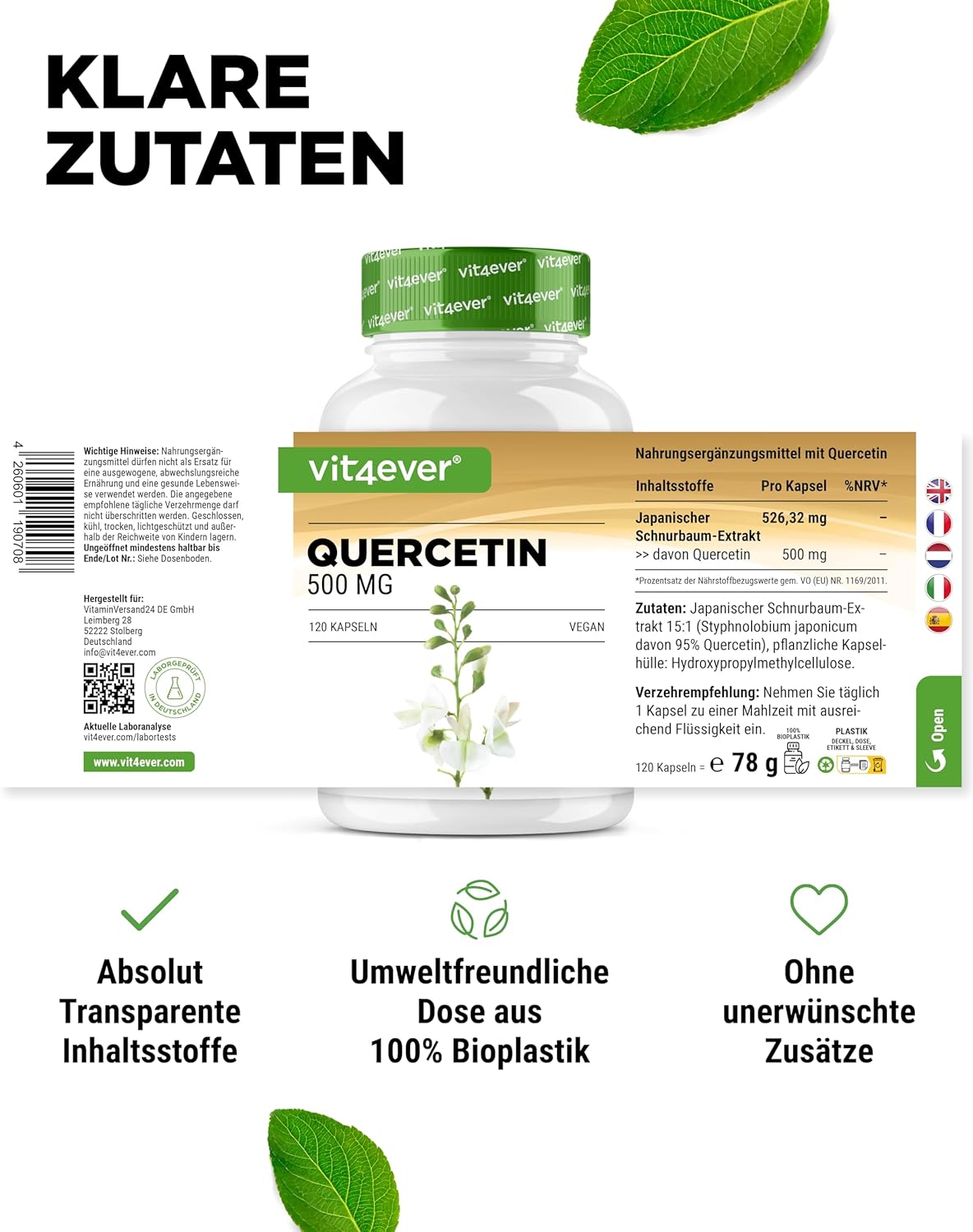 Estratto di albero della corda giapponese 15:1 (Styphnolobium japonicum di cui 98% quercetina), agente di rivestimento: idrossipropilmetilcellulosa (involucro della capsula vegetale), antiagglomerante: estratto di riso.