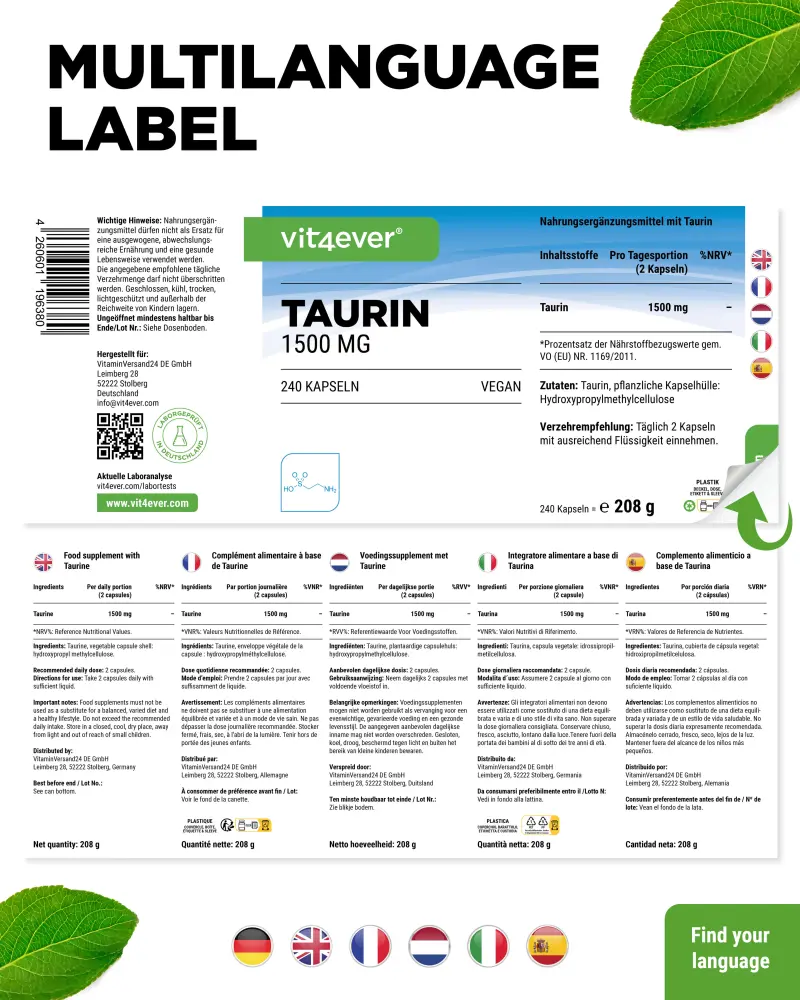 Taurina, involucro della capsula vegetale: idrossipropilmetilcellulosa.