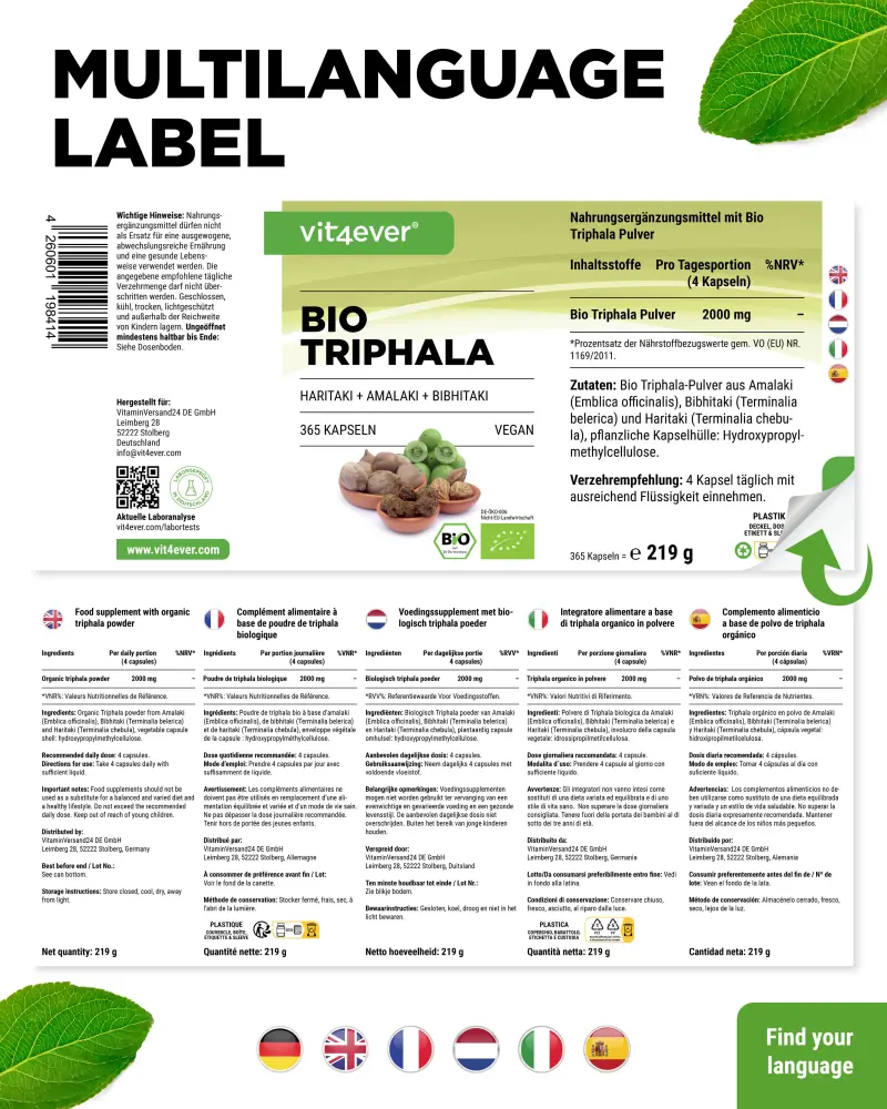 Biologische Triphala-poeder van Amalaki (Emblica officinalis), Bibhitaki (Terminalia belerica) en Haritaki (Terminalia chebula), coatingmiddel: hydroxypropylmethylcellulose (plantaardig).