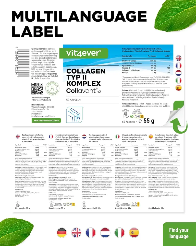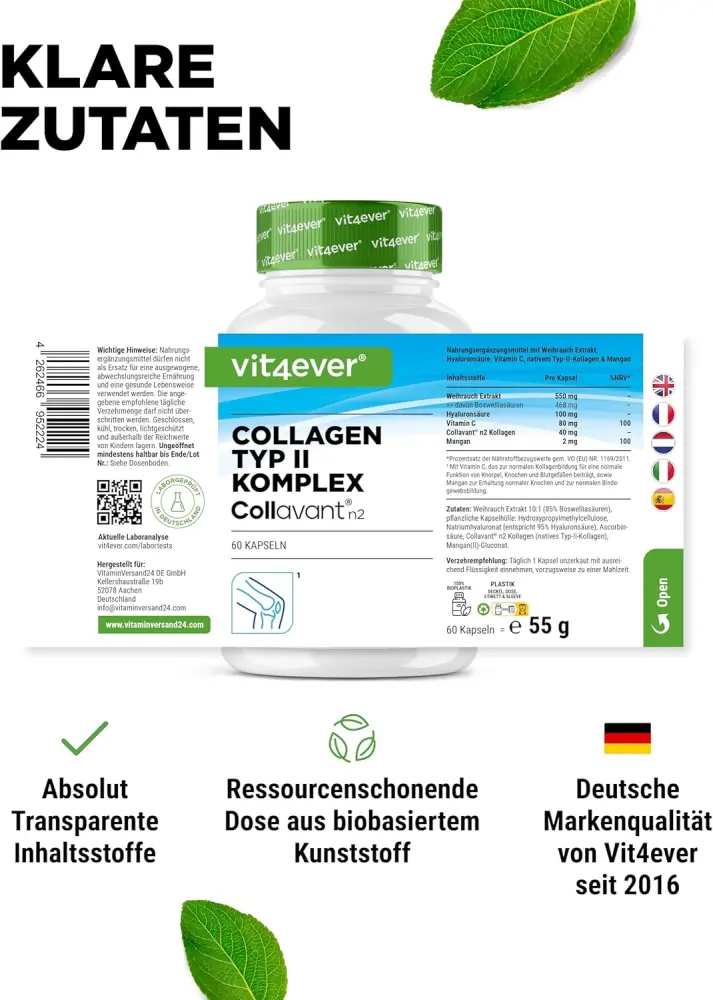 Collageen type II complex, bestaande uit de gepatenteerde grondstof Collavant® n2 collageen, hyaluronzuur en wierookextract, → vitamine C en → mangaan.