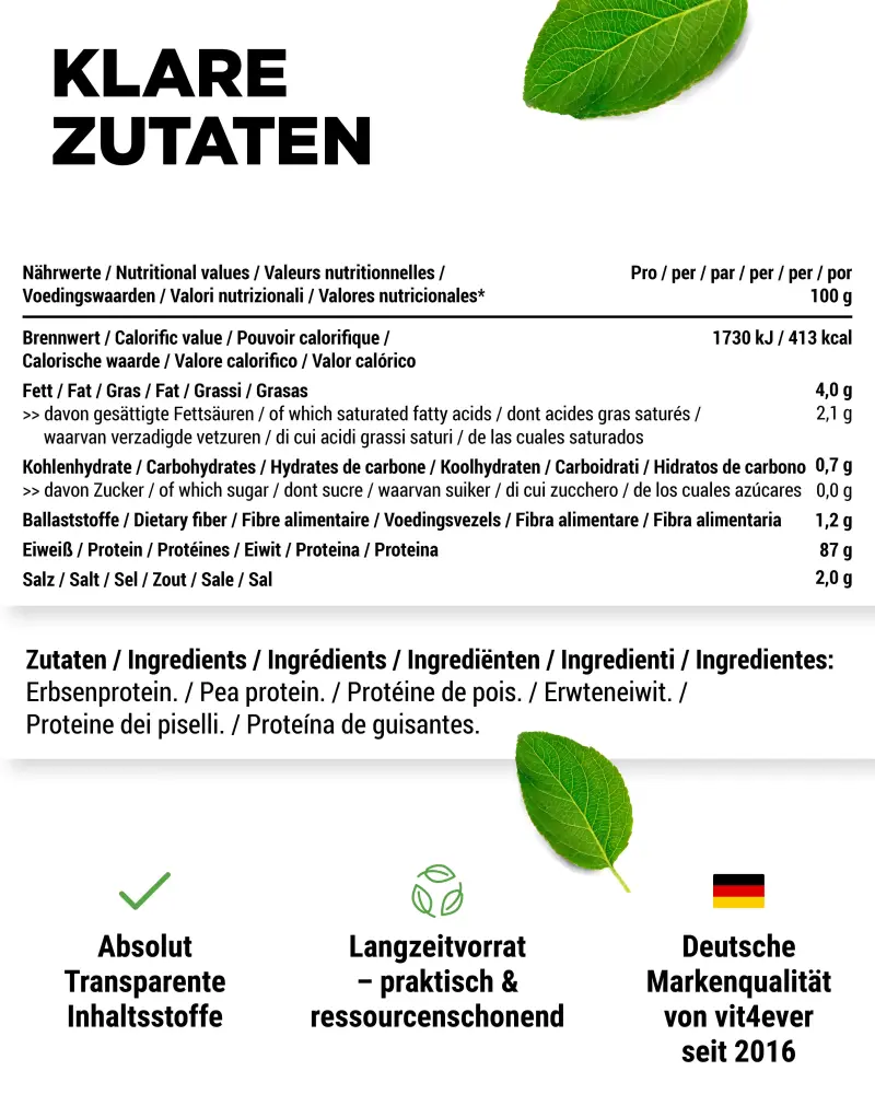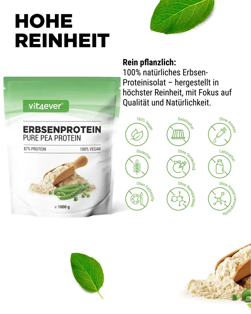 Erwteneiwit is een 100% plantaardig en dus veganistisch alternatief voor wei-eiwit.