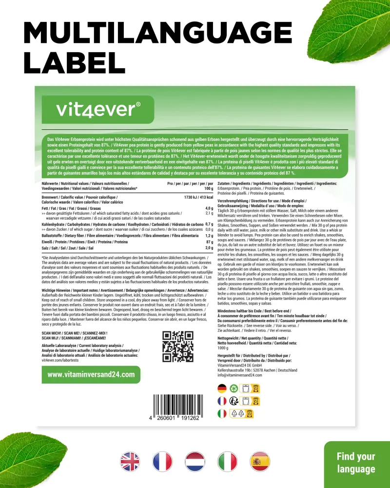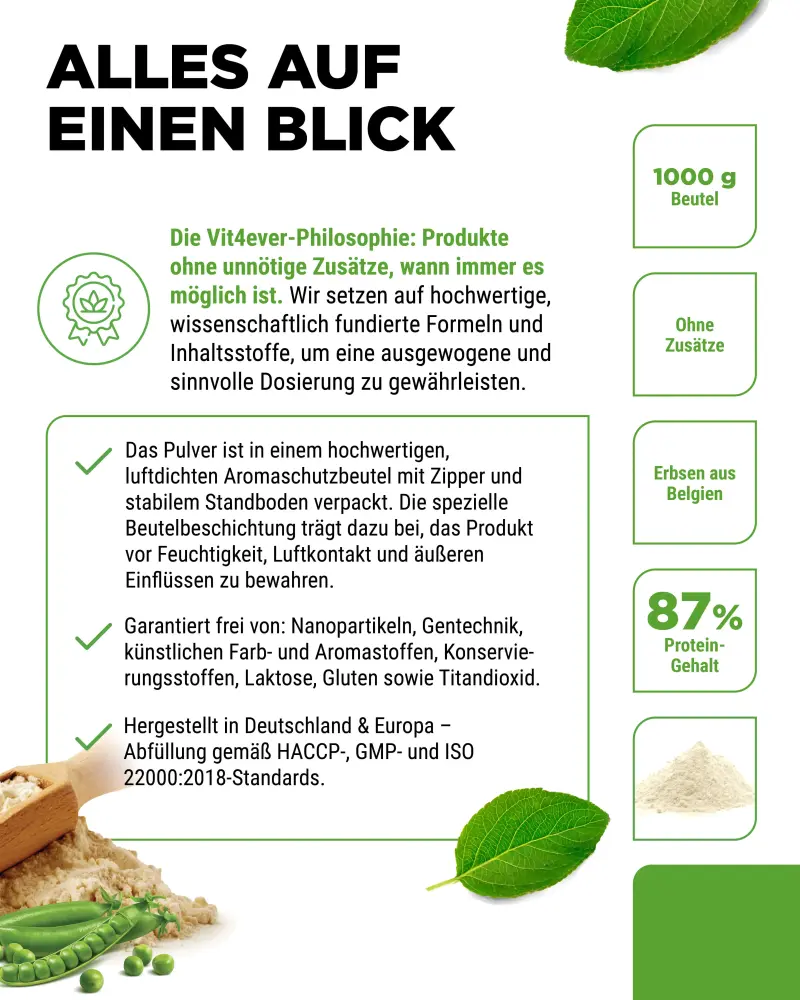 Erwteneiwit biedt een hoog eiwitgehalte van 87% totaal eiwit met een hoog gehalte van meer dan 7% arginine en 6% lysine en bevat ook veel natuurlijk ijzer, fosfor en calcium.