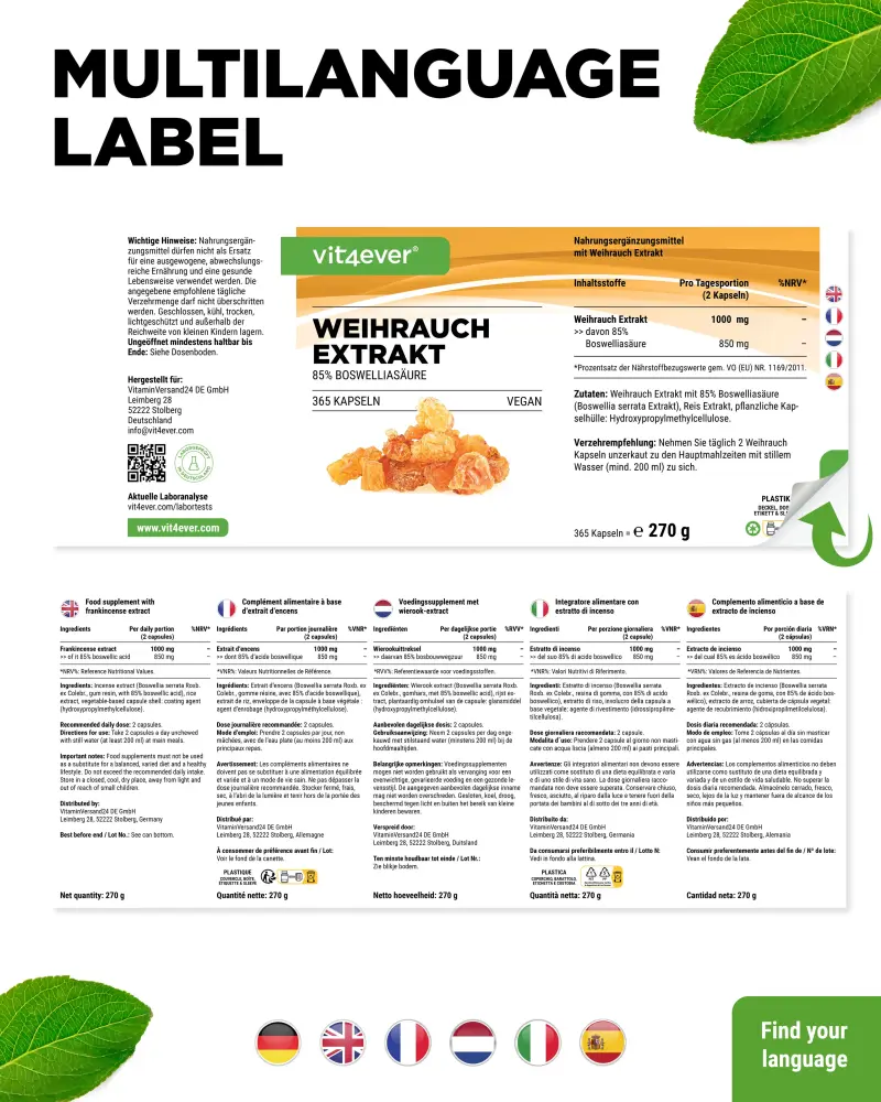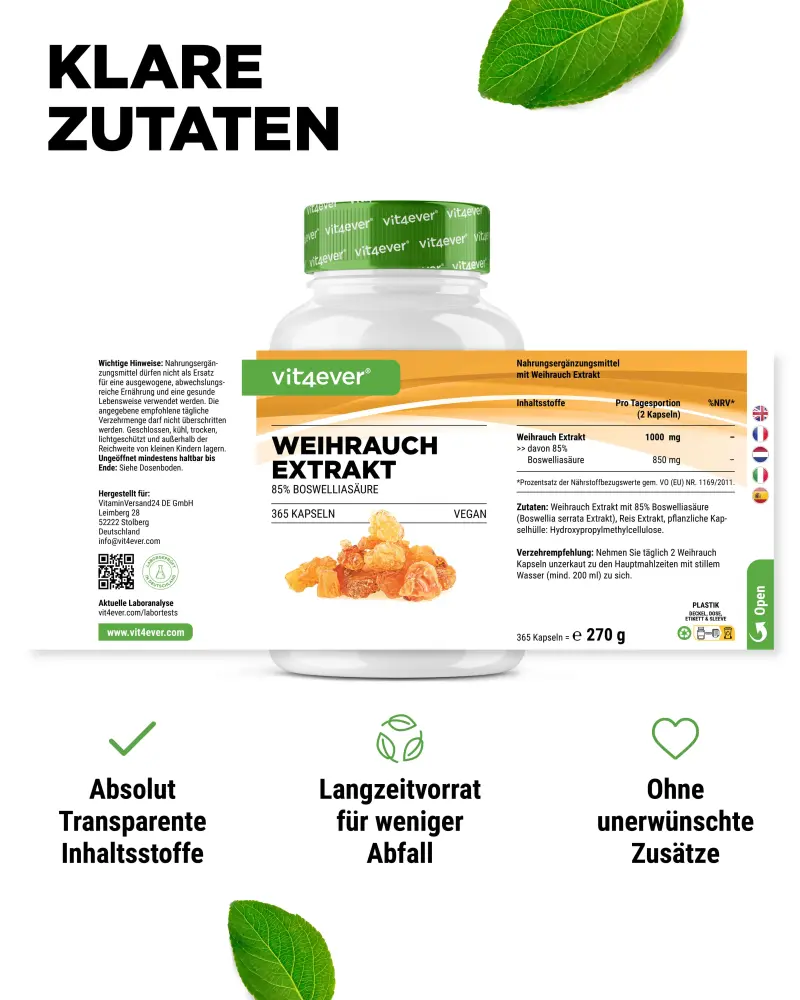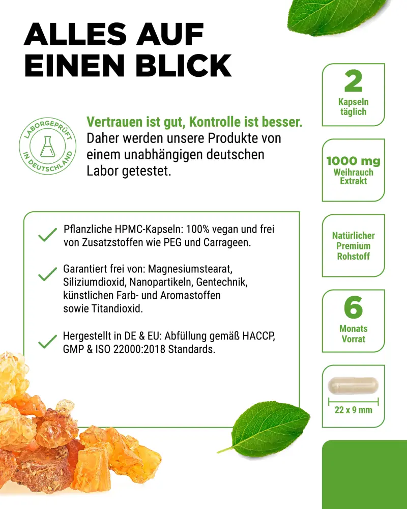 Wierookextract met 85% boswelliazuren (Boswellia serrata-extract), coatingmiddel: hydroxypropylmethylcellulose (plantaardig)