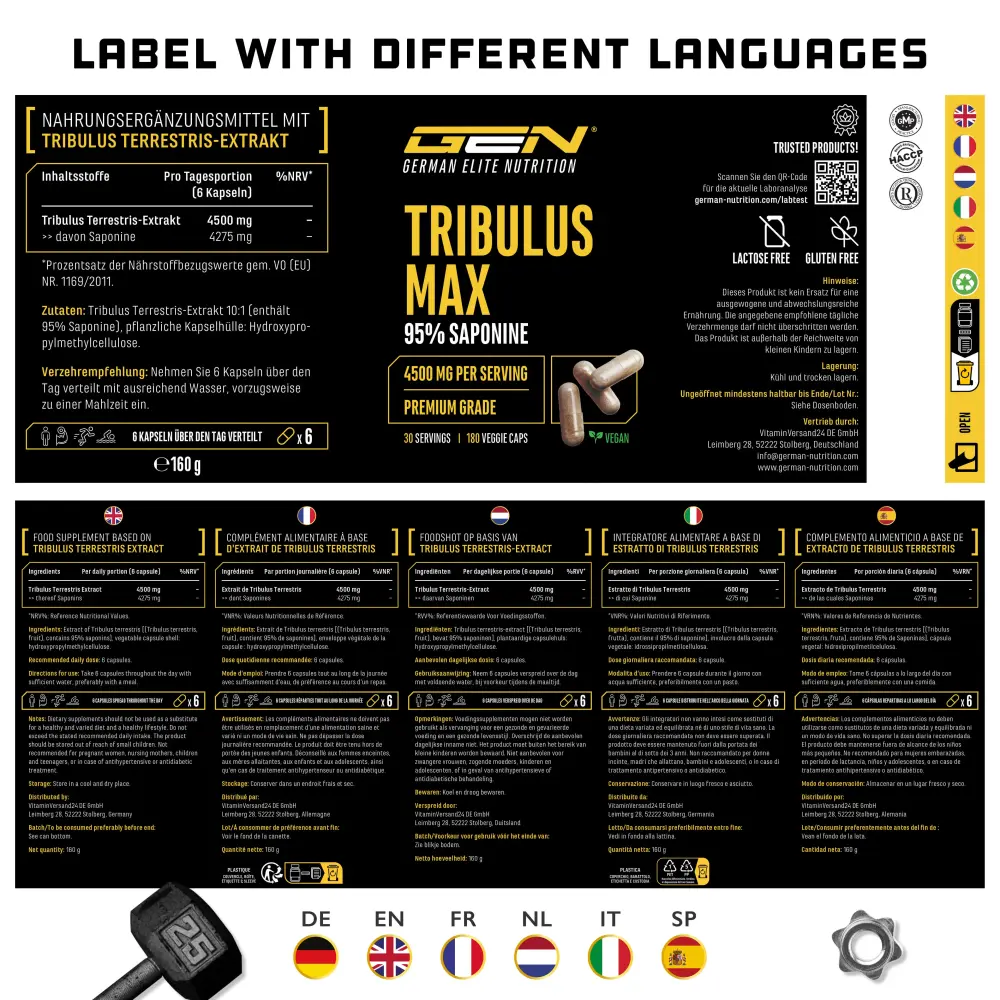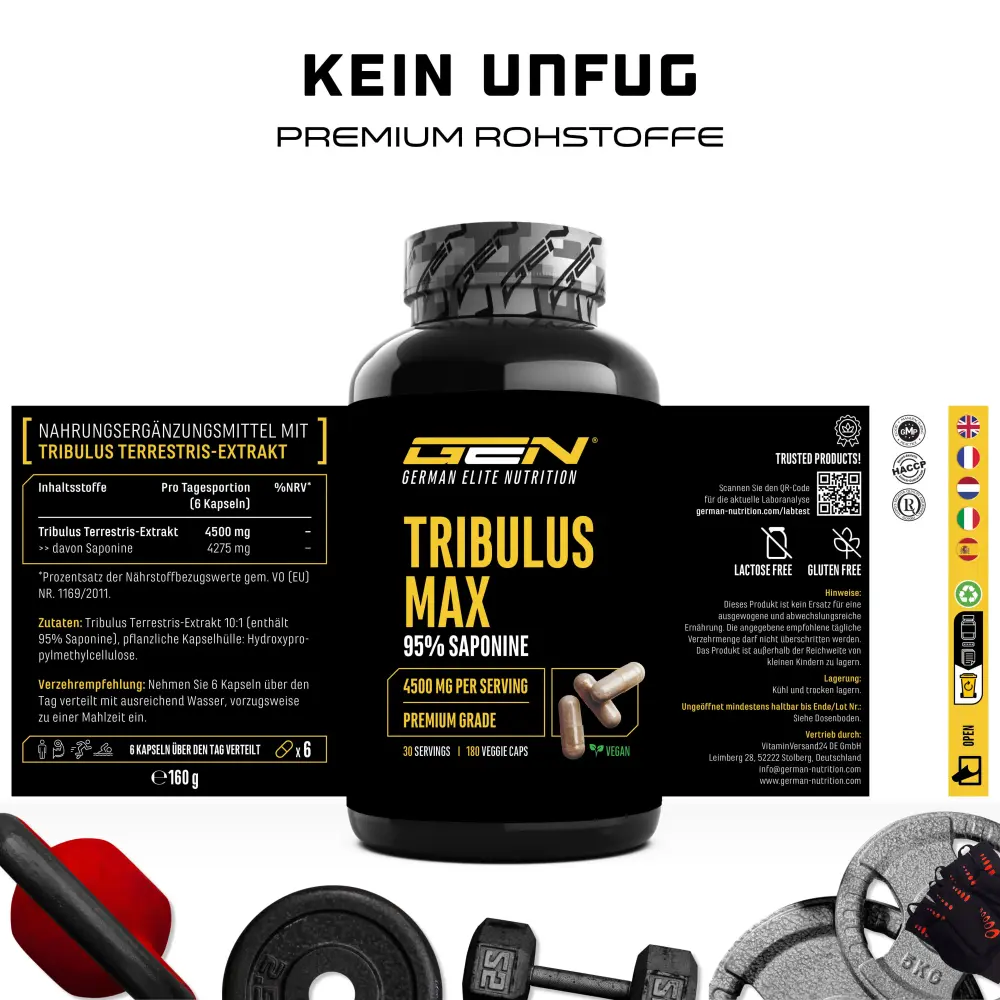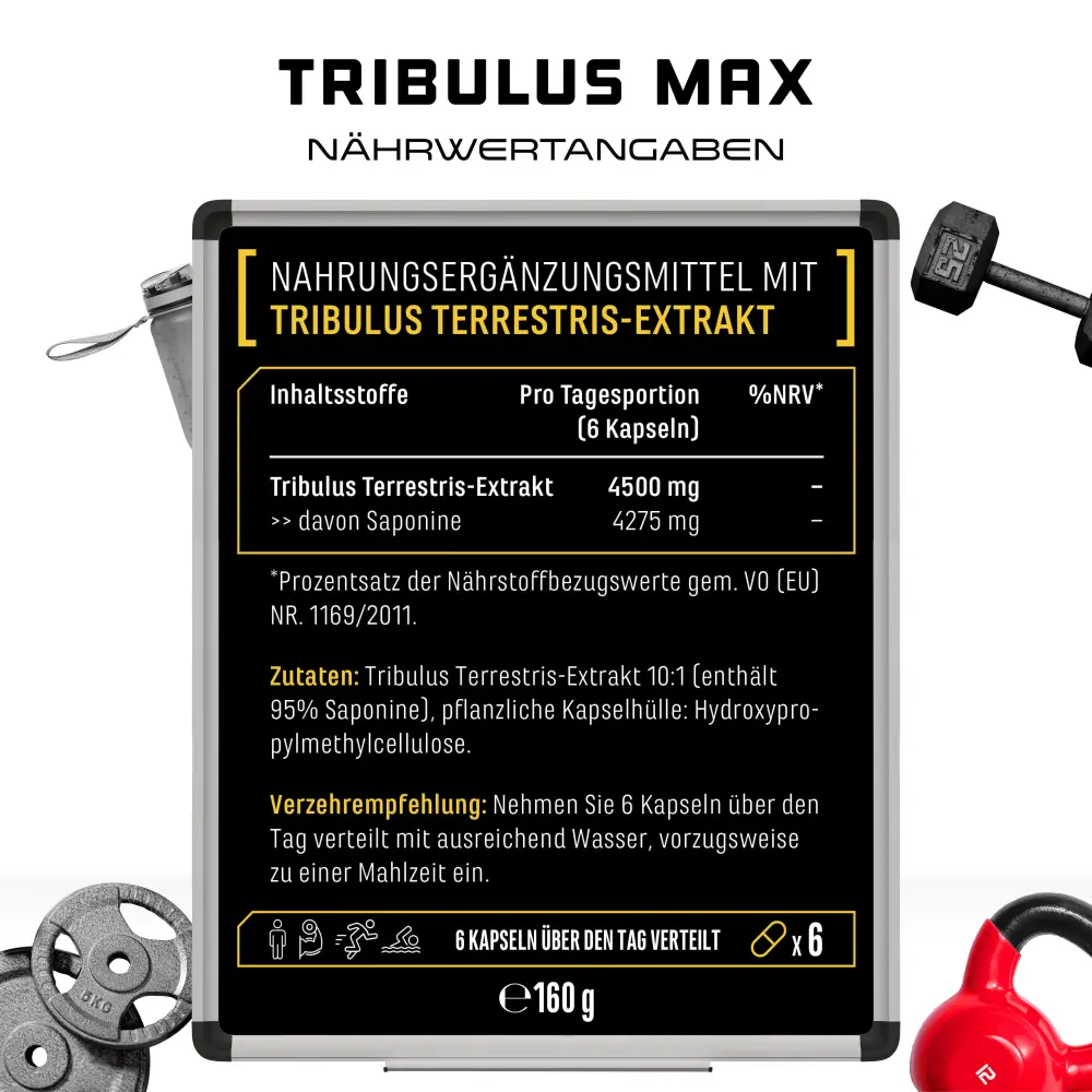 Tribulus terrestris extract 10:1 (bevat 95% saponinen), omhulsel: hydroxypropylmethylcellulose (plantaardige capsulehuls).