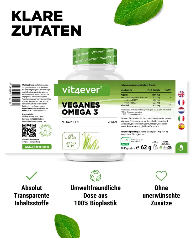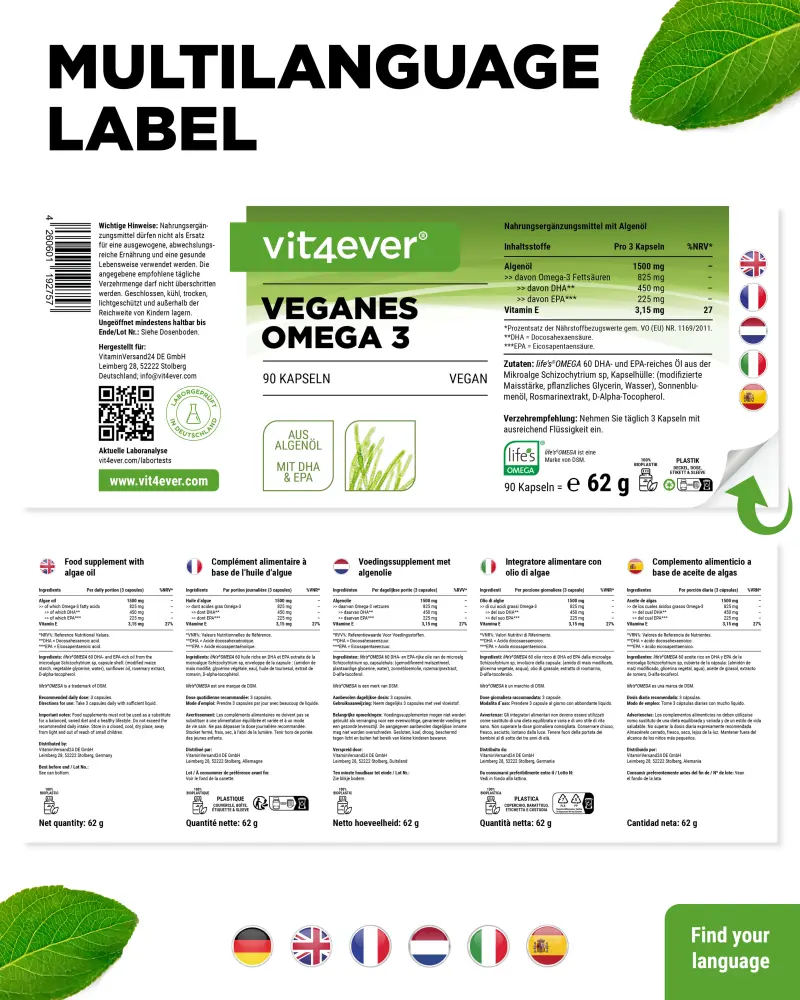 Algenolie omega 3 capsules van Schizochytrium sp. met 30% → DHA (docosahexaeenzuur) en 15% → EPA (eicosapentaeenzuur).