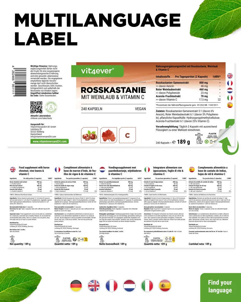 Wyciąg z nasion kasztanowca 5:1 (w tym 6% esciny), wyciąg z liści czerwonego wina 6:1 (w tym 5% polifenoli), substancja powlekająca: hydroksypropylometyloceluloza (pochodzenia roślinnego), wyciąg z owoców aceroli 6:1 (w tym 25% witaminy C).