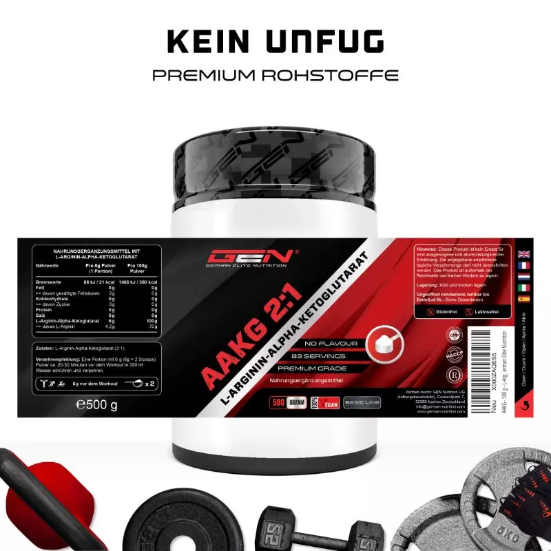 AAKG entsteht durch die Zusammenführung von Arginin und Alpha-Ketoglutarat. Diese Kombination erhöht die Absorption im Vergleich zu regulärem Arginin um bis zu 50 Prozent.