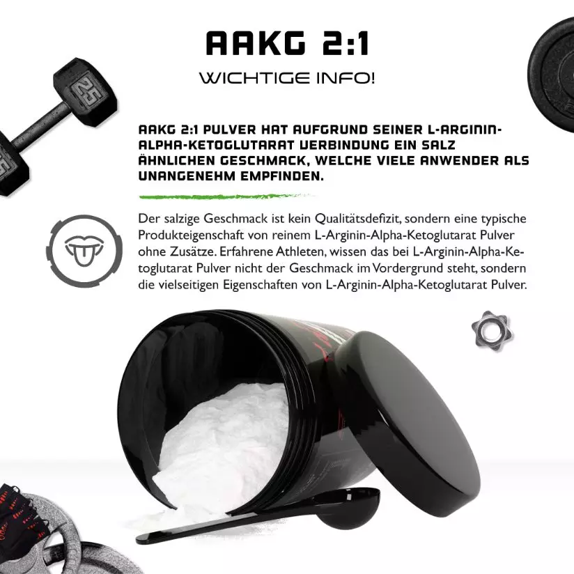 Hinweis: L-Arginin-Alpha-Ketoglutarat Pulver schmeckt typischerweise salzig, was als Zeichen der Reinheit des Produkts gewertet werden sollte.
