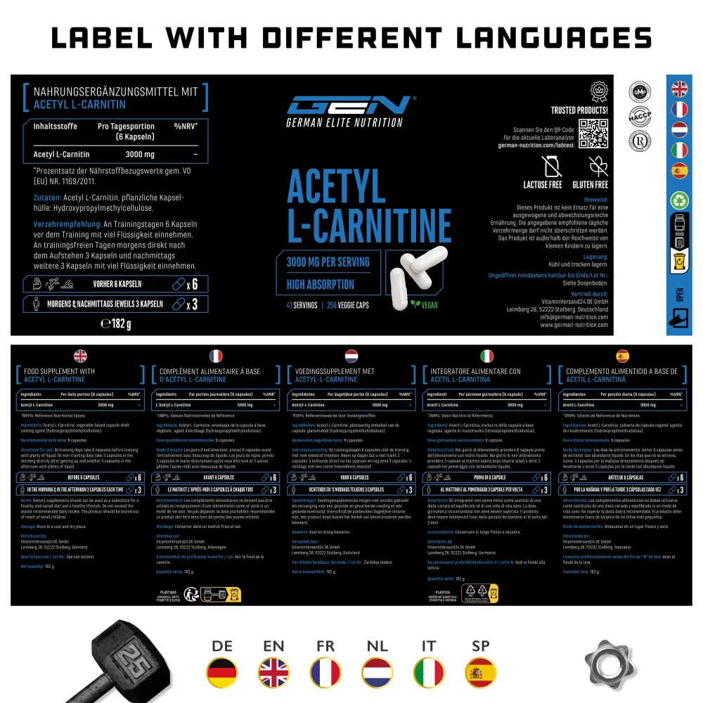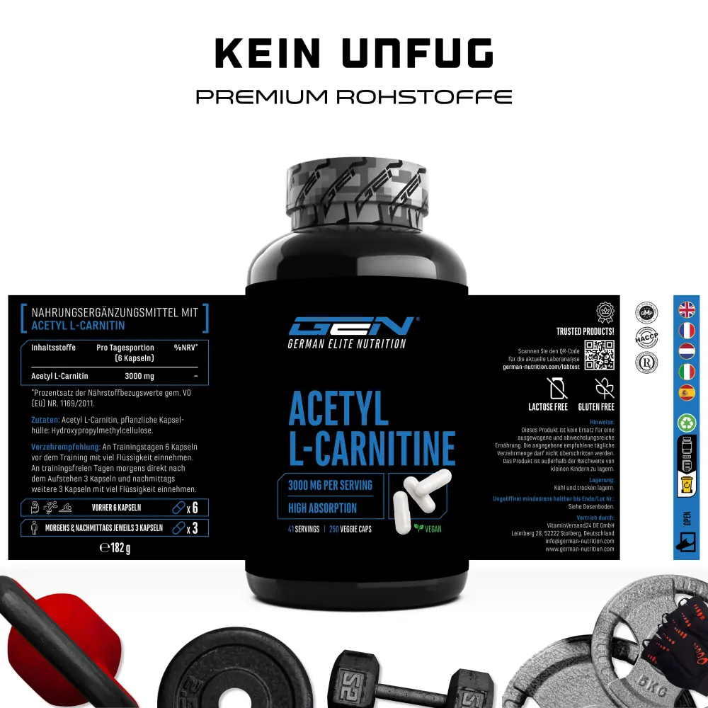 Acetyl L-Carnitin, Überzugsmittel: Hydroxypropylmethylcellulose (pflanzliche Kapselhülle).