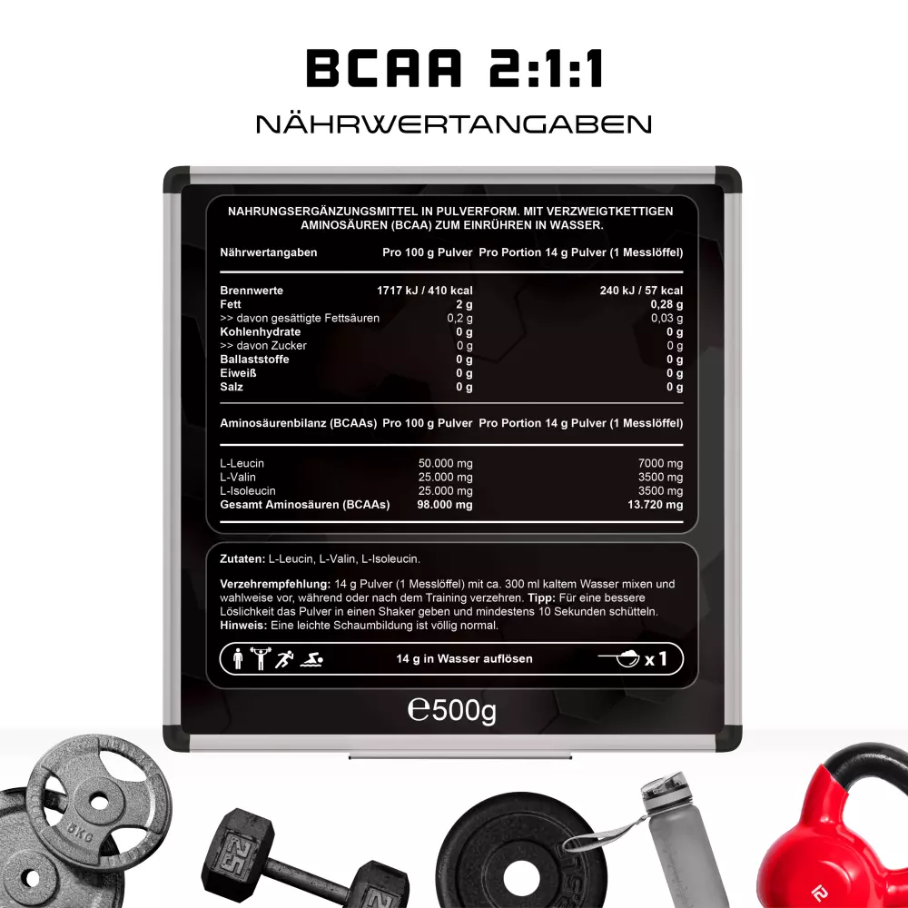 BCAA ist die Abkürzung für Branched-Chain Amino Acids und fasst die proteinogenen Aminosäuren Leucin, Valin und Isoleucin zusammen.