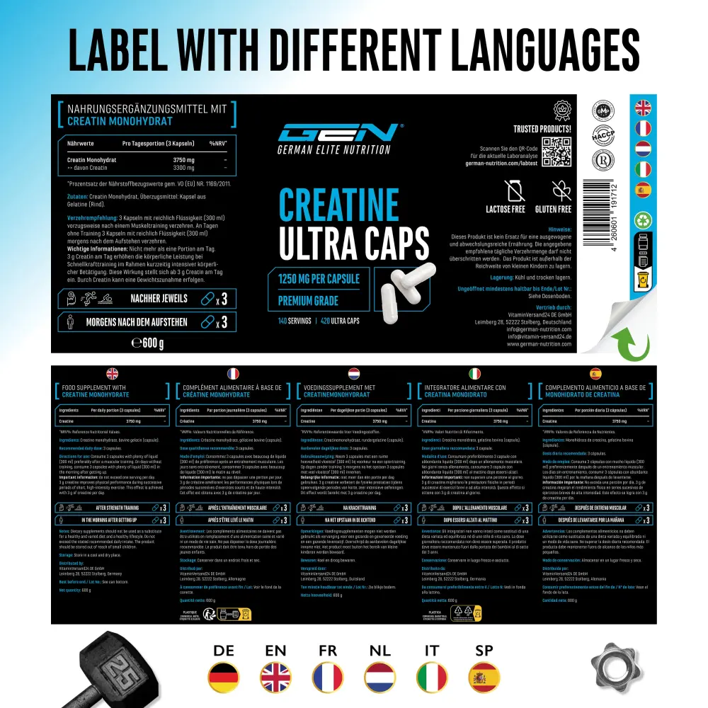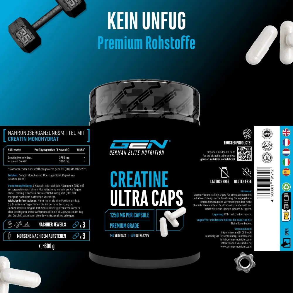 Creatin Ultra Caps sind mit 1250 mg Wirkstoffgehalt pro Kapsel sehr hoch dosiert.