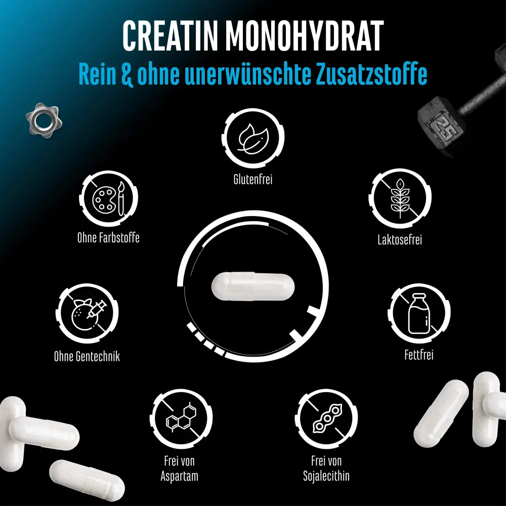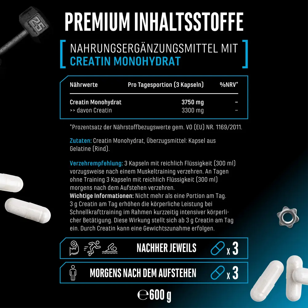 Creatin Monohydrat, Überzugsmittel: Kapsel aus Gelatine (Rind).