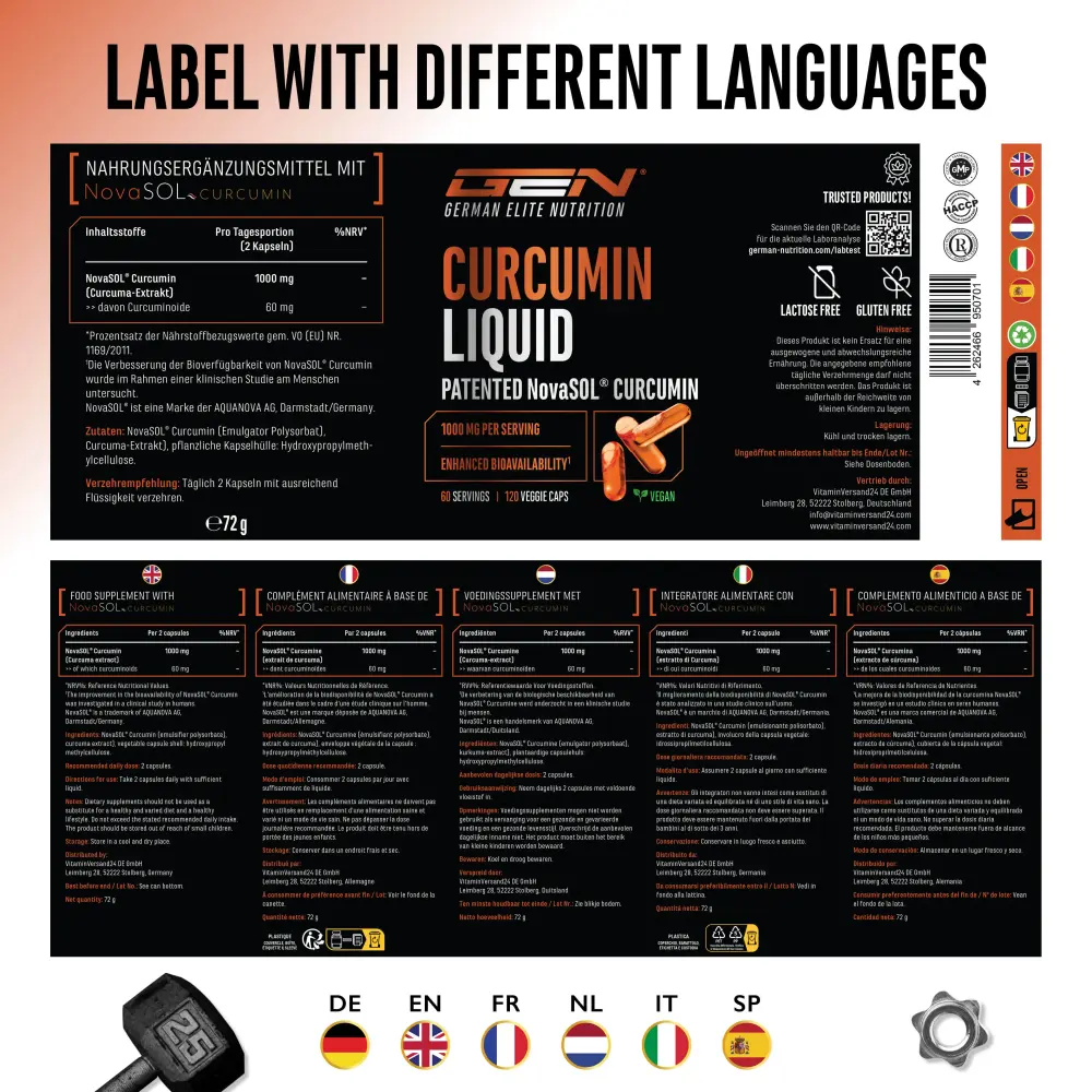 NovaSOL® Curcumin (Emulgator Polysorbat), Curcuma-Extrakt, pflanzliche Kapselhülle: Hydroxypropylmethylcellulose.