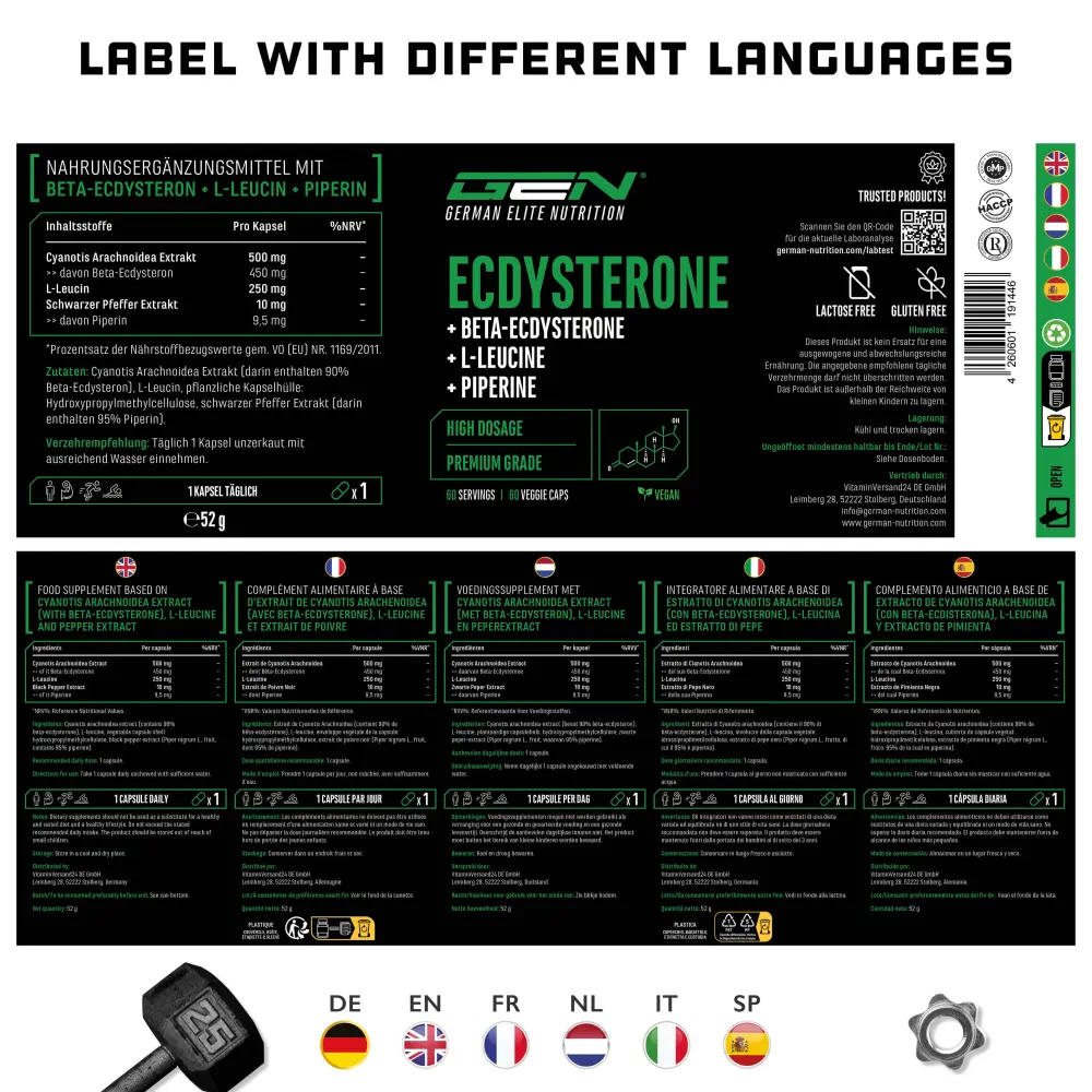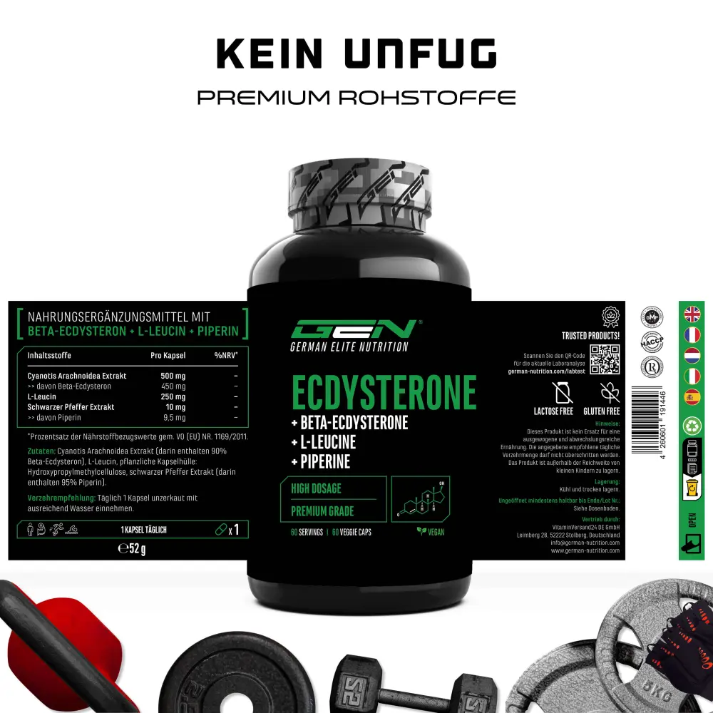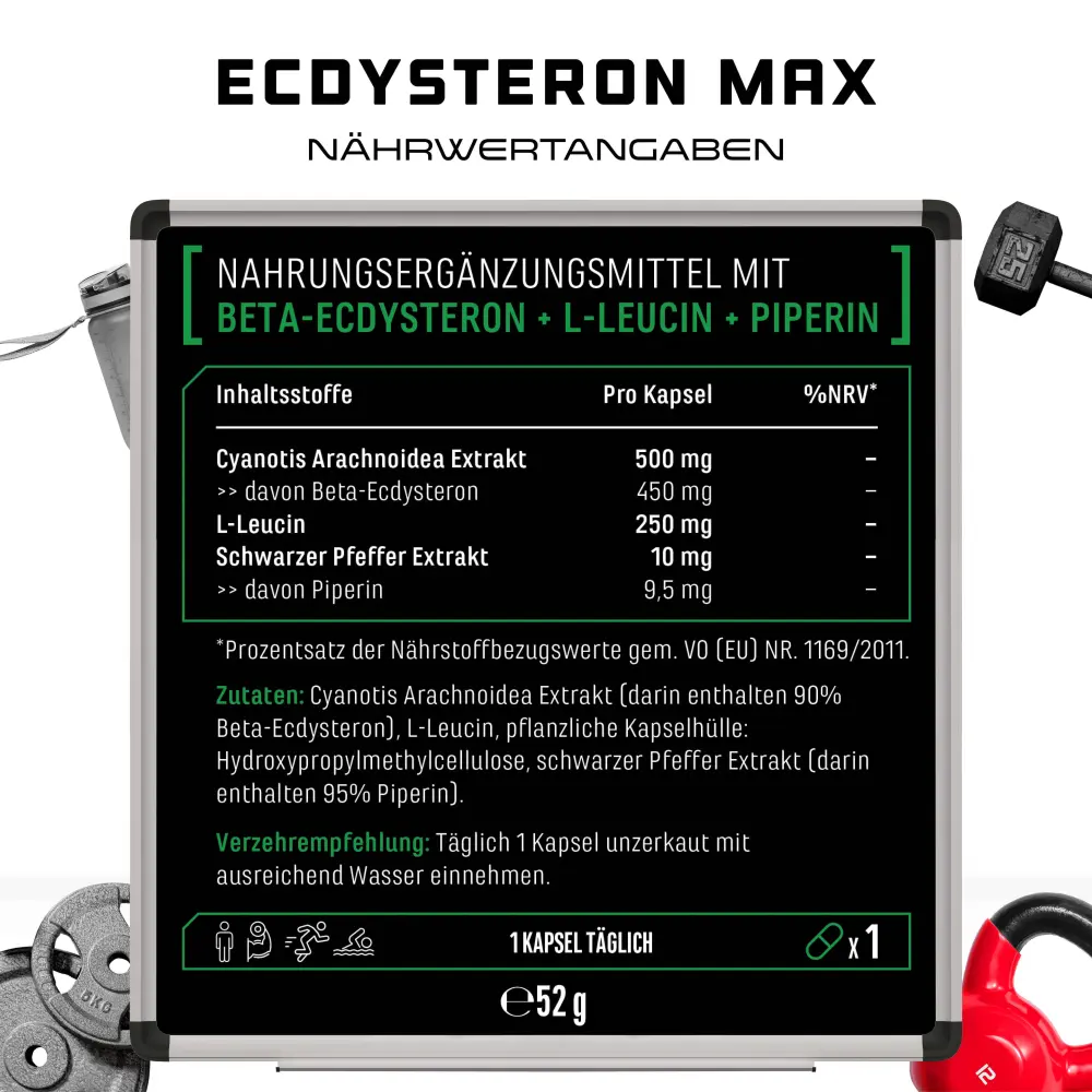 Cyanotis Arachnoidea Extrakt (darin enthalten 90% Beta-Ecdysteron), L-Leucin, Überzugsmittel: Hydroxypropylmethylcellulose (pflanzliche Kapselhülle), Schwarzer Pfeffer Extrakt (darin enthalten 95% Piperin).