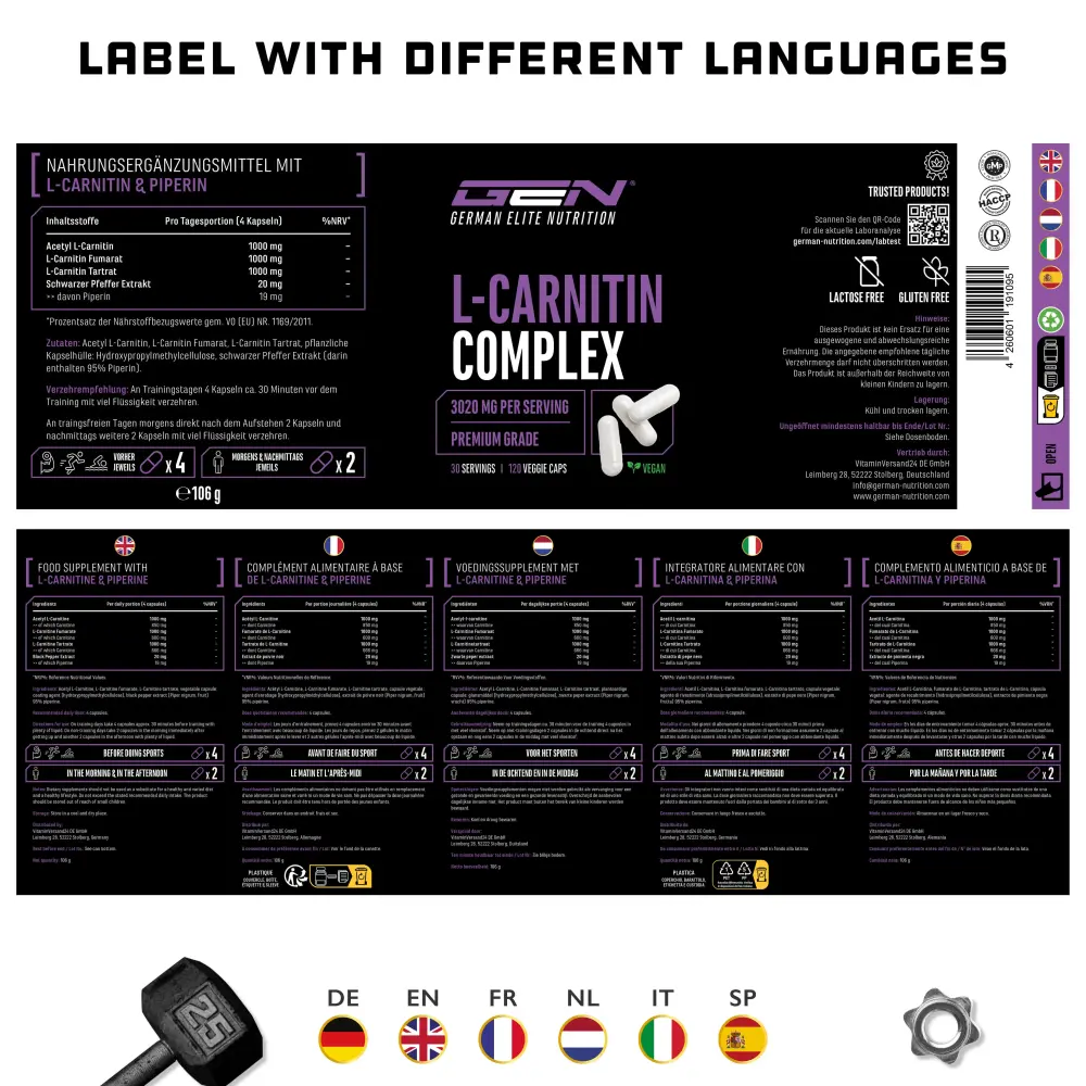 Acetyl L-Carnitin, L-Carnitin Fumarat, L-Carnitin Tartrat, Überzugsmittel: Hydroxypropylmethylcellulose (pflanzliche Kapselhülle), Schwarzer Pfeffer Extrakt (darin enthalten 95% Piperin), Trennmittel: Reis Extrakt.