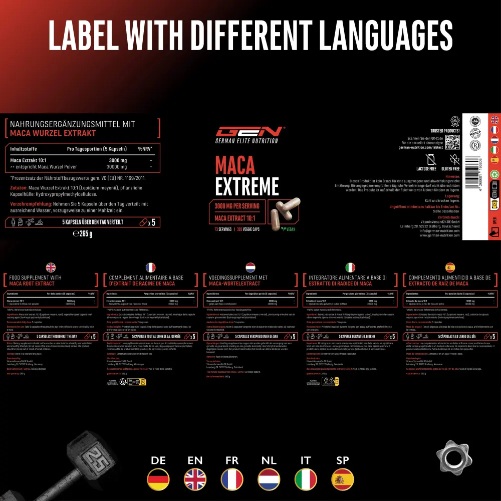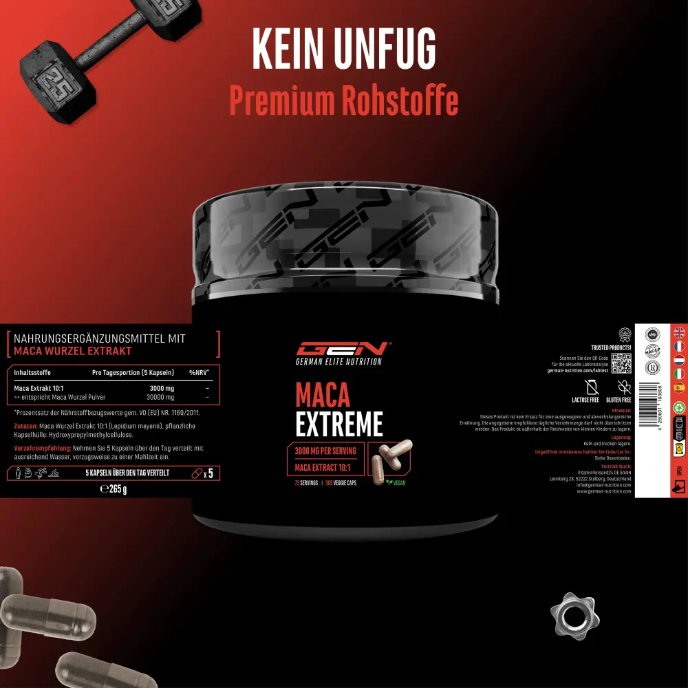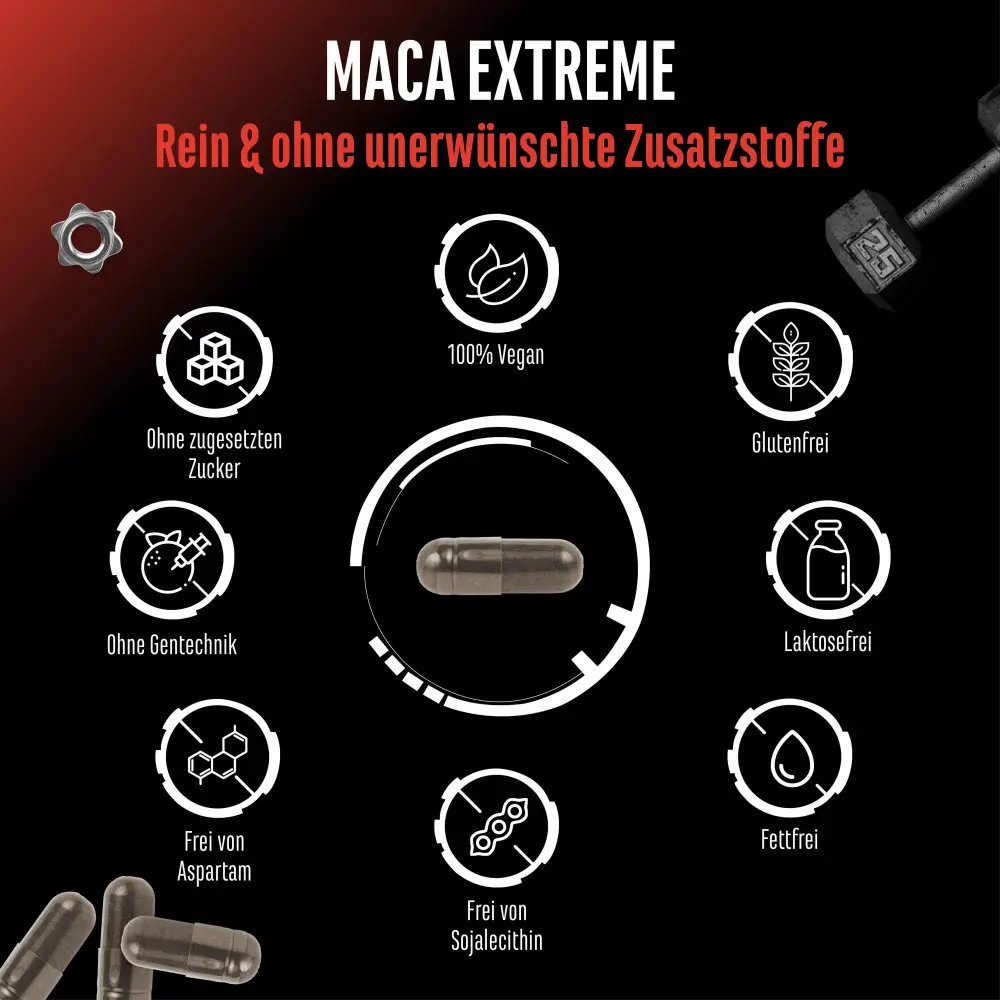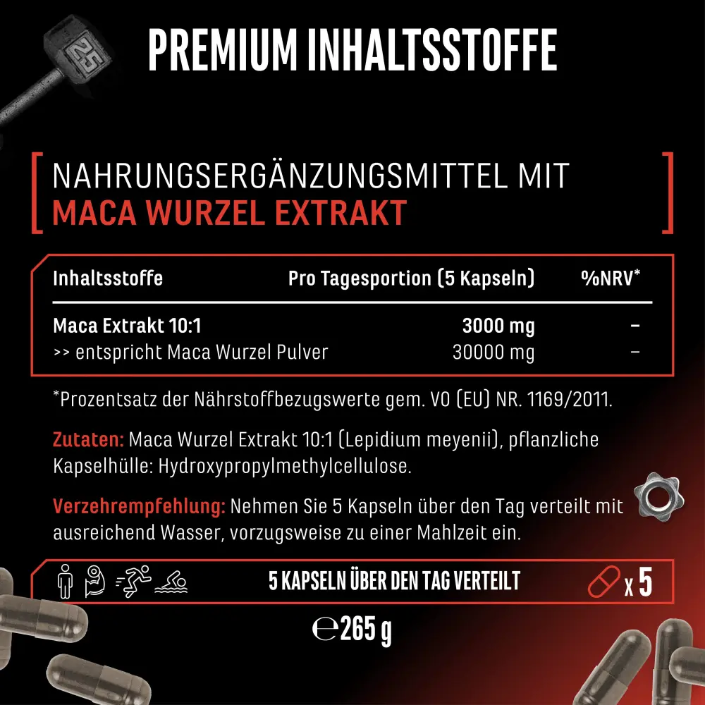 Jede Kapsel enthält 600 mg 10:1 Maca Wurzel Extrakt, was 6 g Wurzelpulver entspricht.