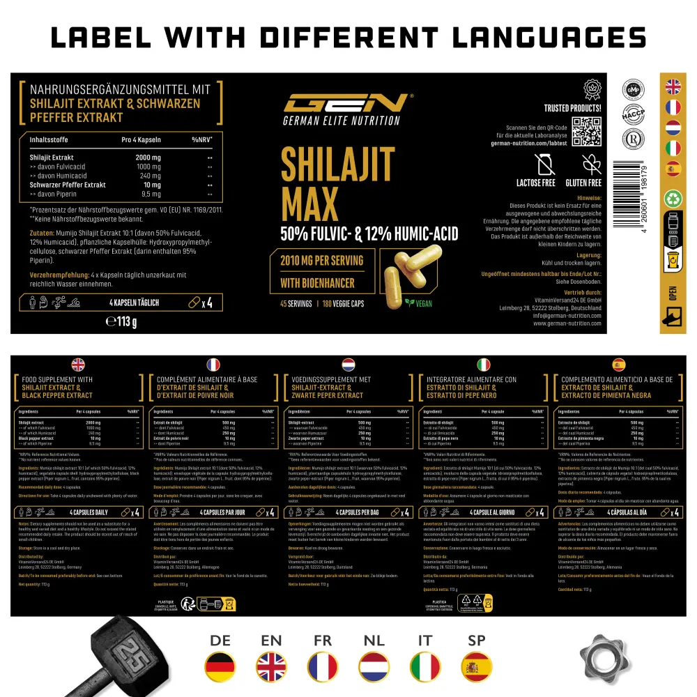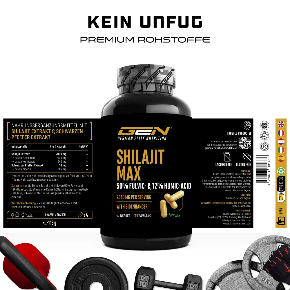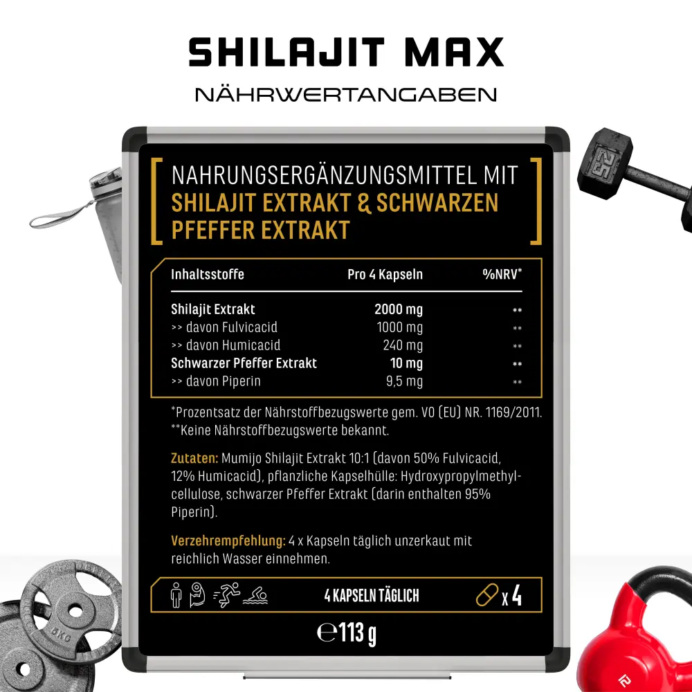 Mumijo Shilajit Extrakt 10:1 (50% Fulvicacid, 12% Humicacid), Hydroxypropylmethylcellulose (pflanzliche Kapselhülle), Schwarzer Pfeffer Extrakt (95% Piperin).