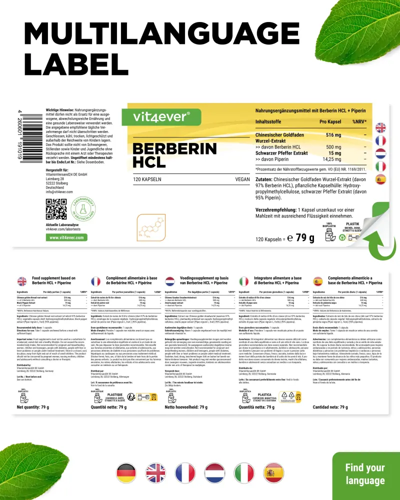 Berberin Extrakt (davon 97% Berberin HCL) aus den Wurzeln des chinesischen Goldfadens (Coptis chinensis Franch), Überzugsmittel: Hydroxypropylmethylcellulose (pflanzliche Kapselhülle), Schwarzer Peffer Extrakt (davon 95% Piperin), Trennmittel: Reis Extrakt.
