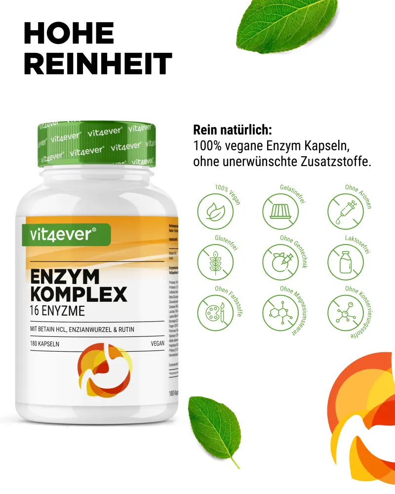 Enzym Komplex ist eine Komposition aus Rutin, Enzian Wurzelextrakt, Betain und 15 verschiedenen Enzymen, die unterschiedliche, aber aufeinander abgestimmte Effekte auf unsere Verdauung und die Gesundheit unseres Darms haben.