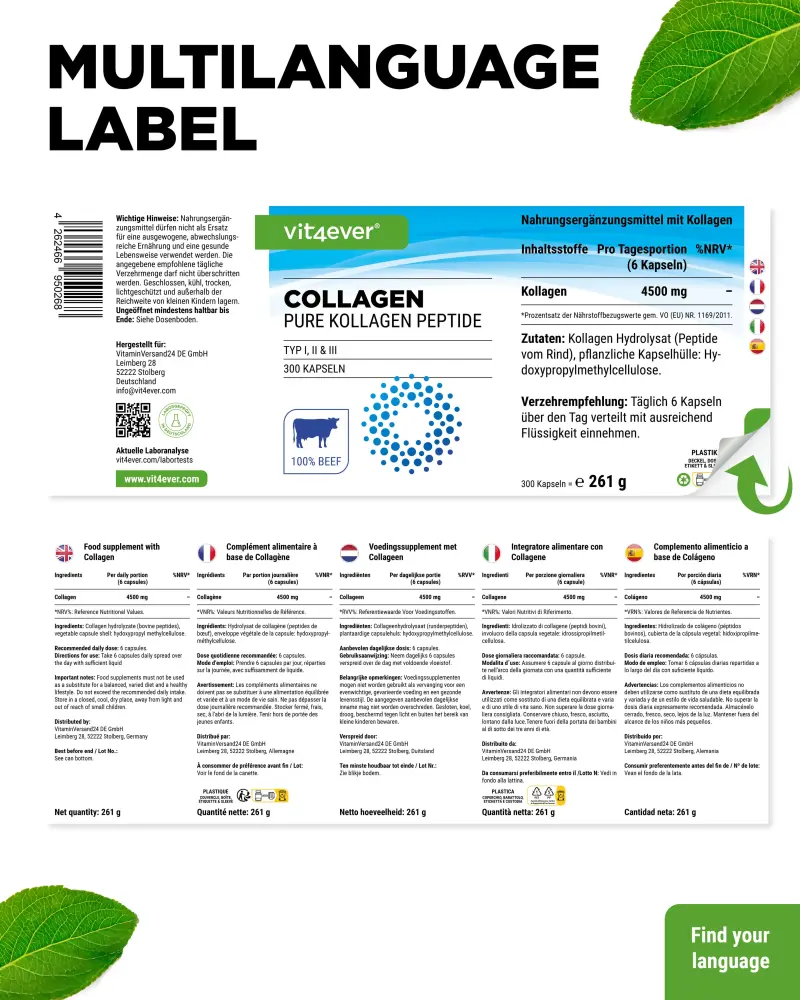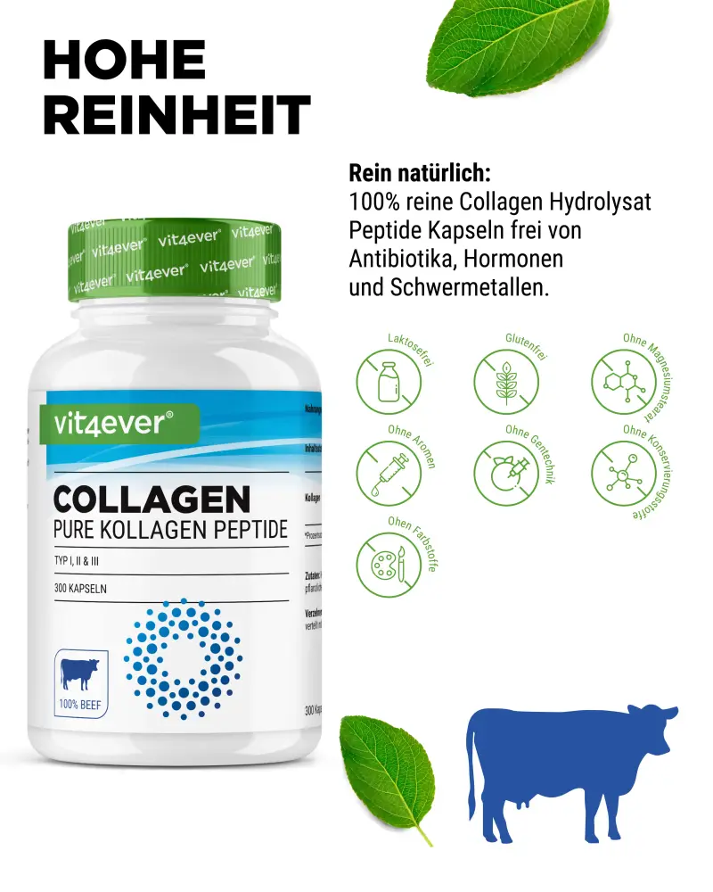 Kollagen Hydrolysat Peptide (Rind), pflanzliche Kapselhülle: Hydroxypropylmethylcellulose.