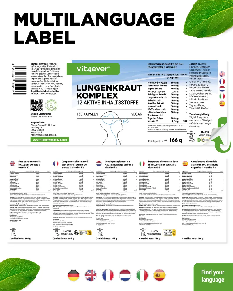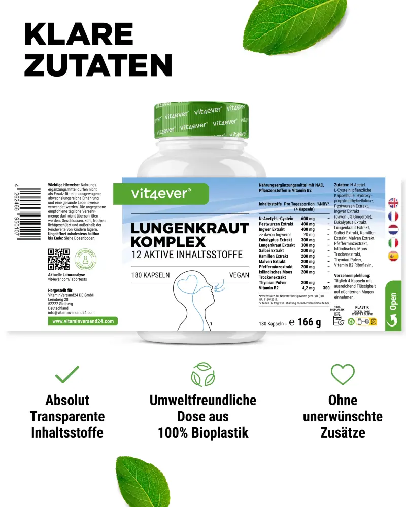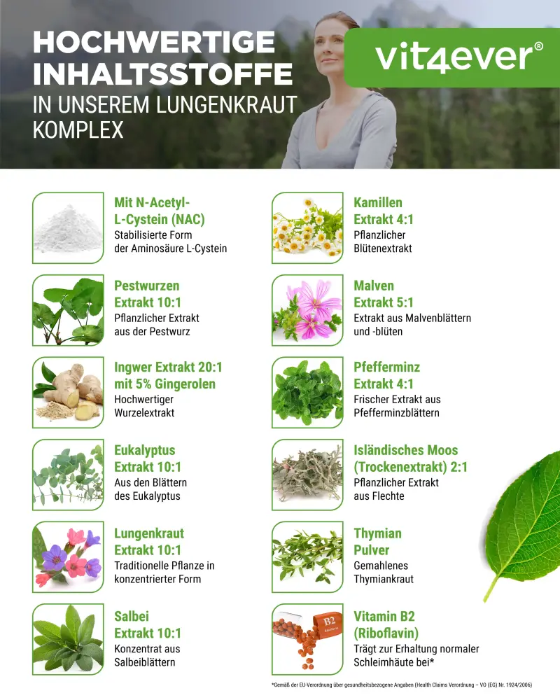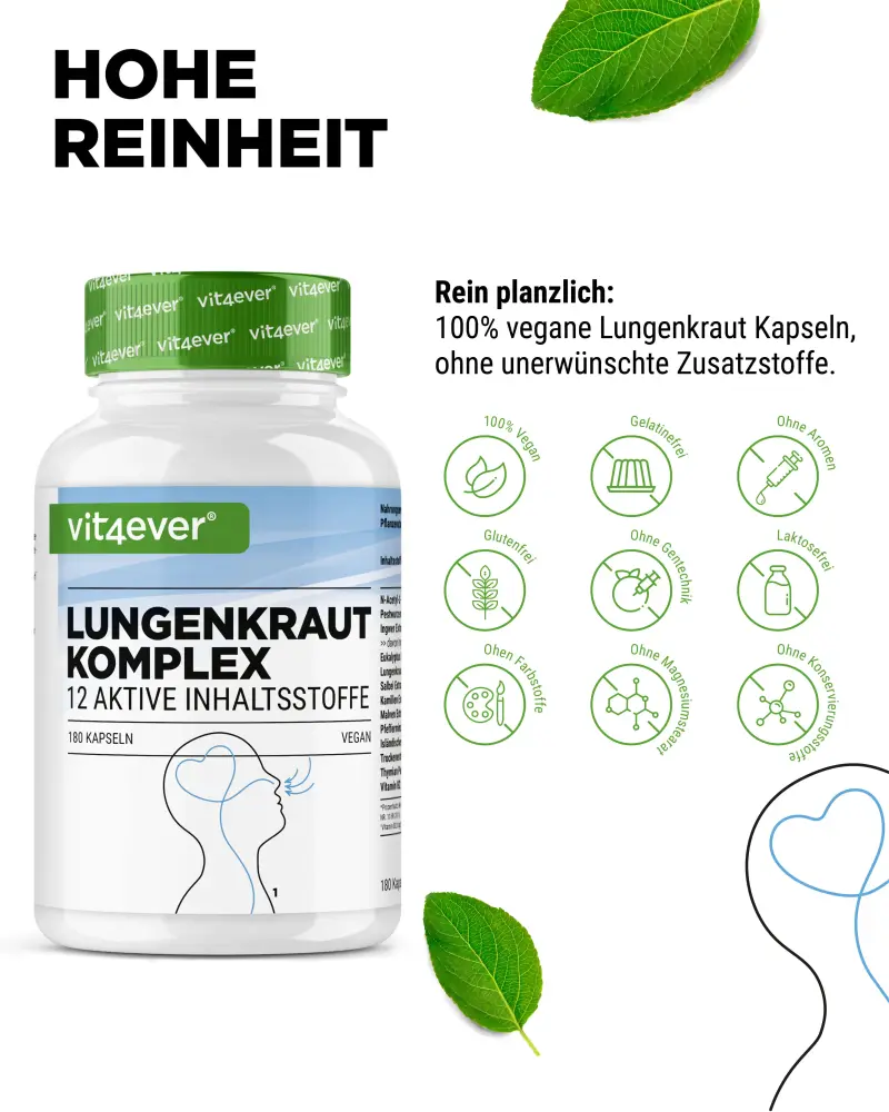 Lungenkraut Komplex kombiniert 12 traditionelle Pflanzen und Mikronährstoffe, die für ihre Unterstützung der Atemwege und der Bronchien bekannt sind.