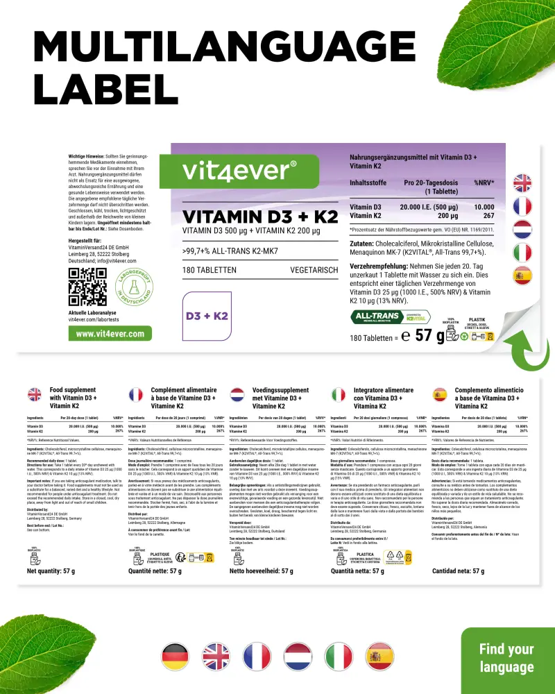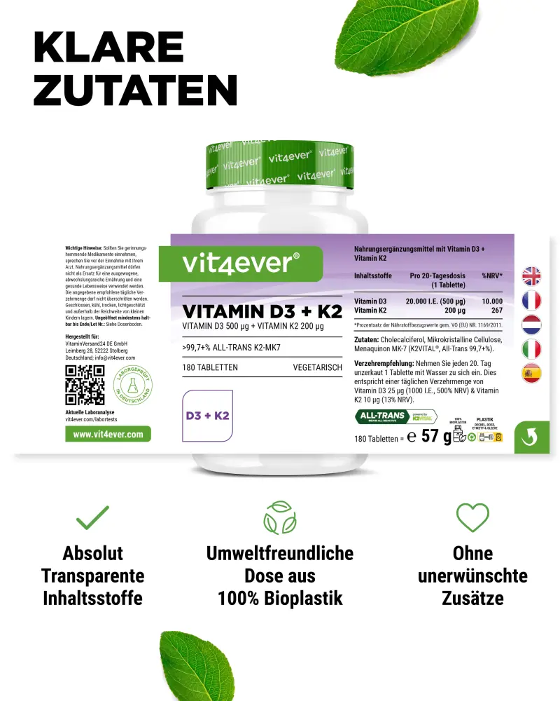 Hochdosiertes → Vitamin D3 mit 20.000 I.E., kombiniert mit → Vitamin K2 auf Basis des Premium Rohstoffs K2VITAL.