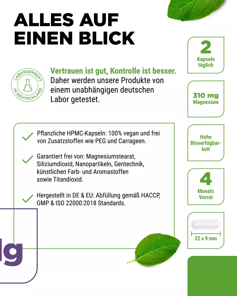Bisglicinato de magnésio, agente de revestimento: hidroxipropilmetilcelulose (vegetal), agente de enchimento: celulose microcristalina, agente antiaglomerante: ácido esteárico.