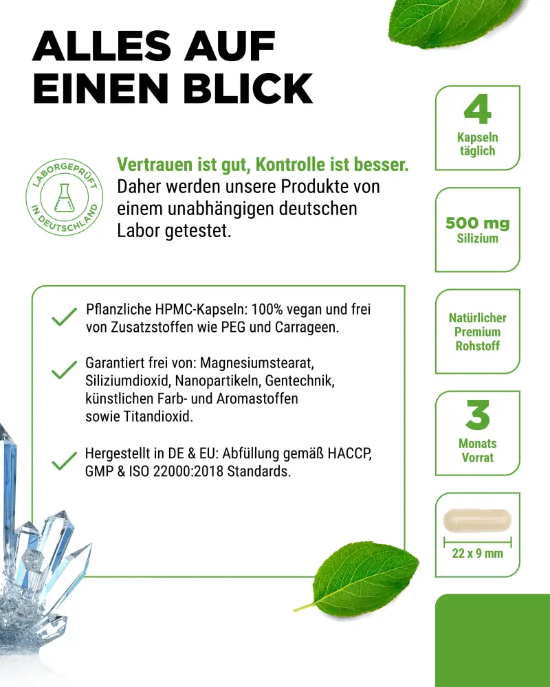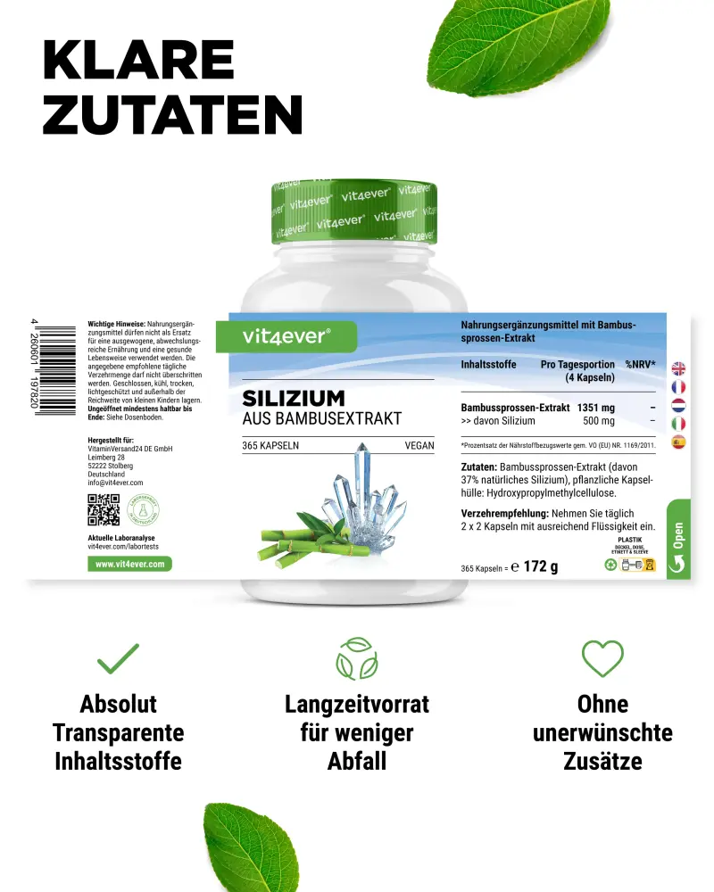 Extrato de rebentos de bambu (dos quais 37% de silício natural), agente de revestimento: hidroxipropilmetilcelulose (de origem vegetal).
